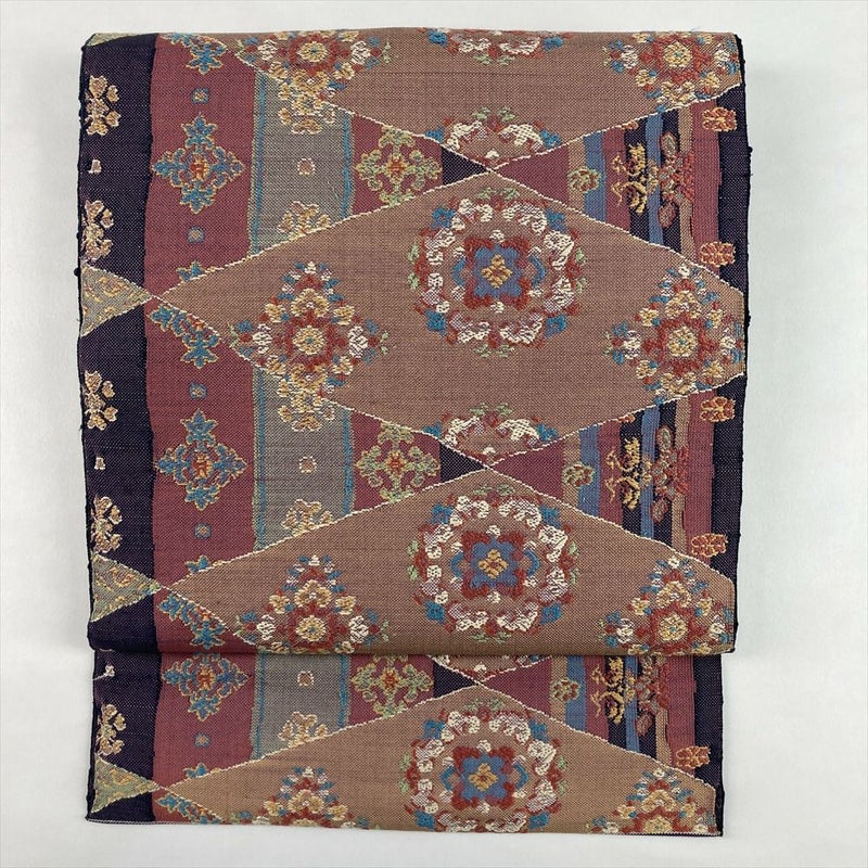 (中古)名古屋帯 紫 ピンク カジュアル 平仕立て 織り 華文 間道 絹