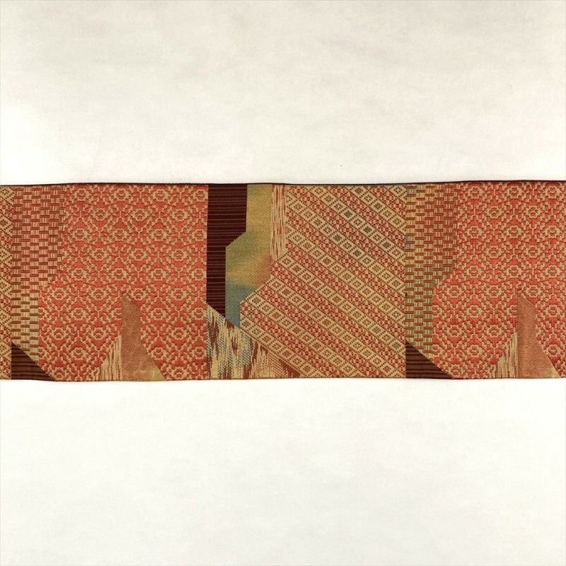 (中古)名古屋帯 茶 朱 カジュアル 松葉仕立て 織り 総柄 切り嵌め 幾何学 絹