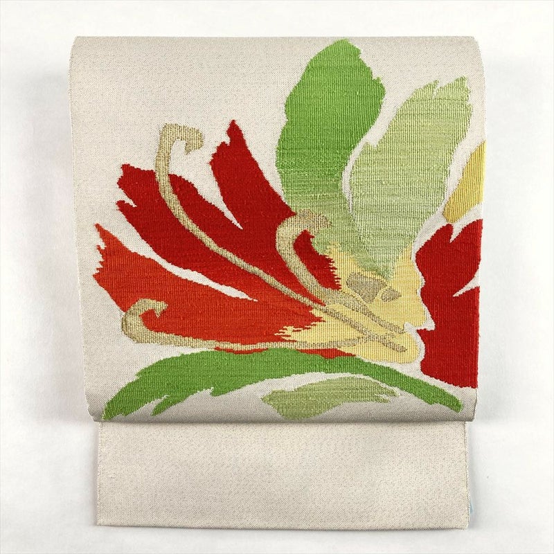 柔らかなアイボリーに、金糸と色糸で織り出された大輪の花が華やかに咲く名古屋帯。