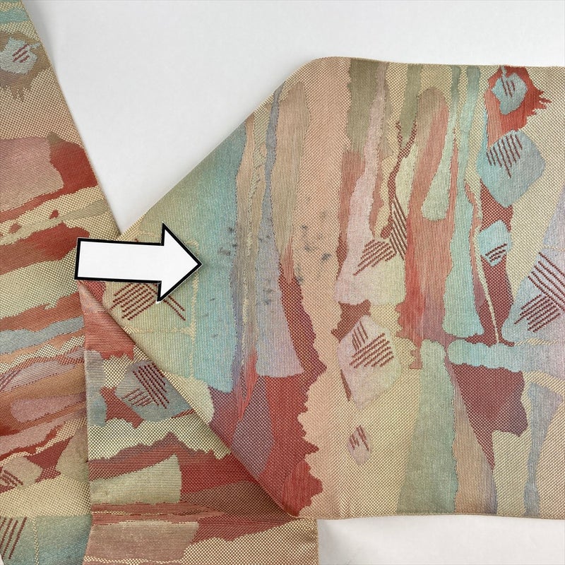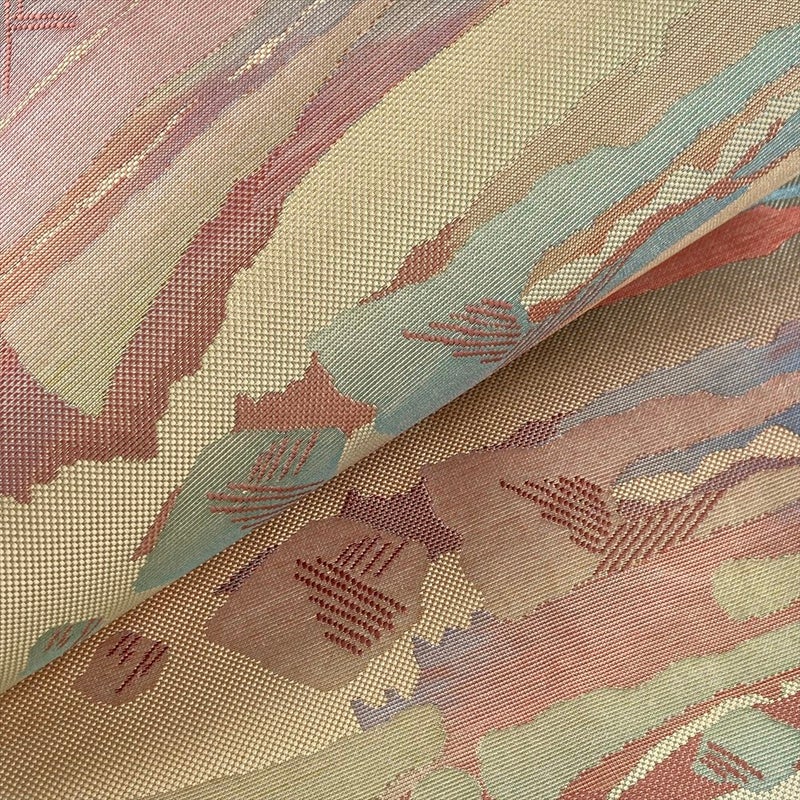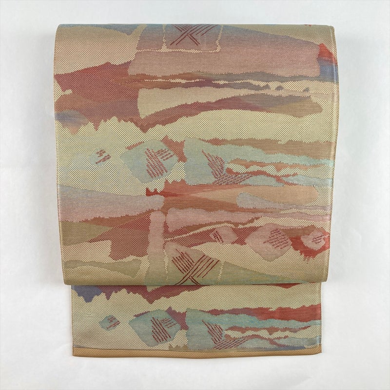 (中古)名古屋帯 ベージュ カジュアル 名古屋仕立て 織り 抽象柄 絹