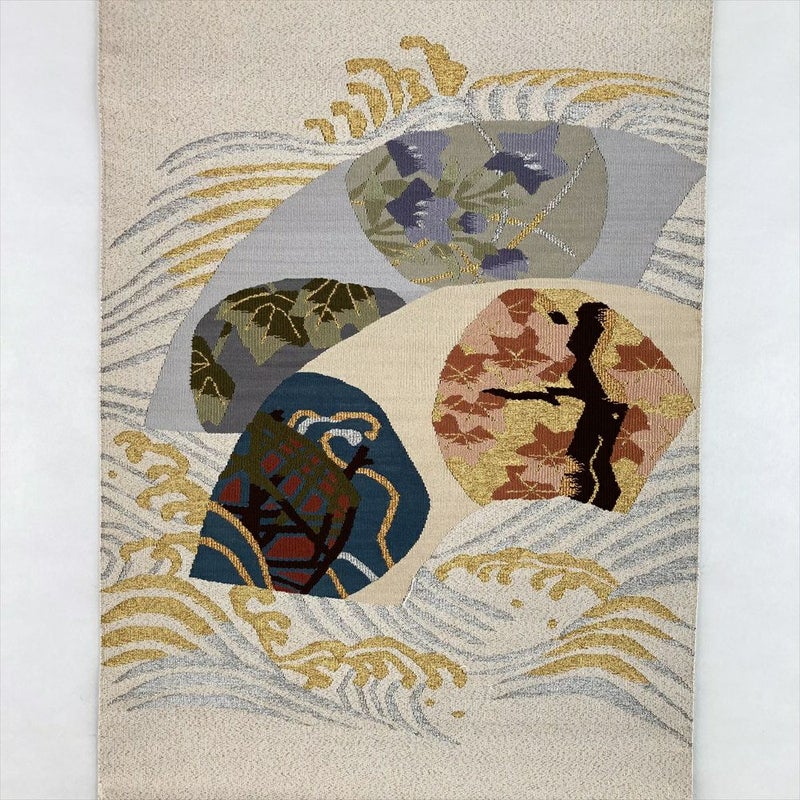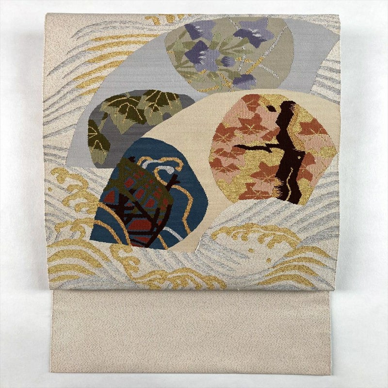 白茶の地に、綴れ織で扇面と波を織り込んだ名古屋帯。