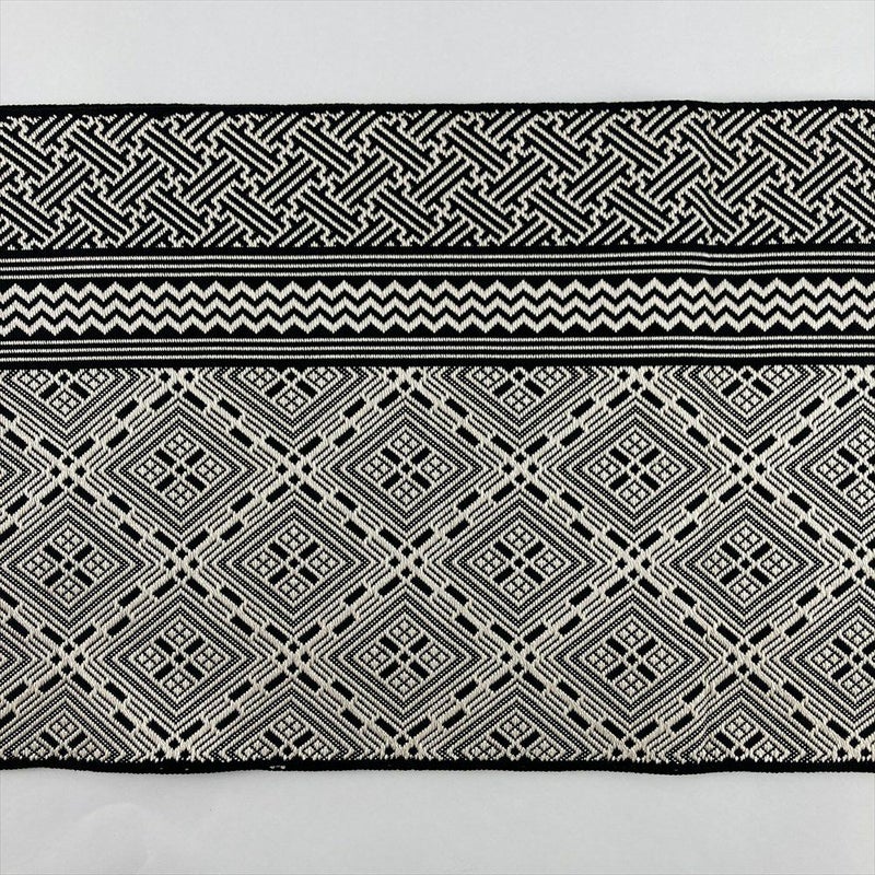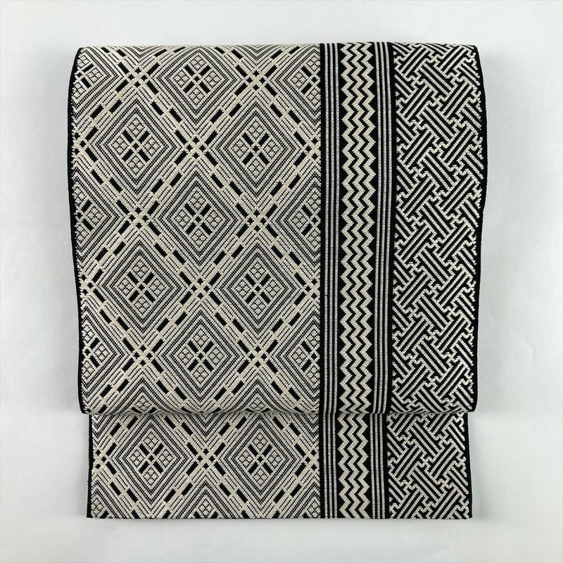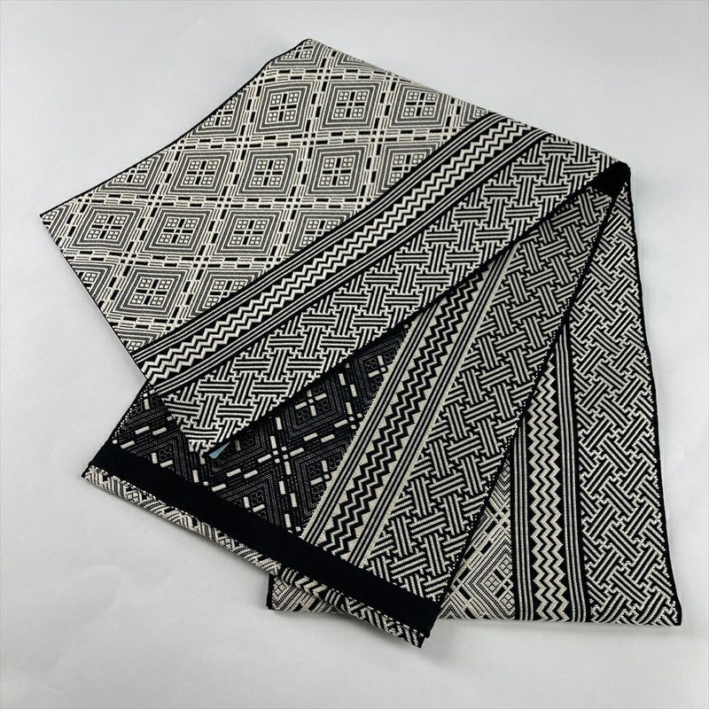 (中古)名古屋帯 モノトーン 黒 白 カジュアル 平仕立て 織り こぎん刺し調 絹