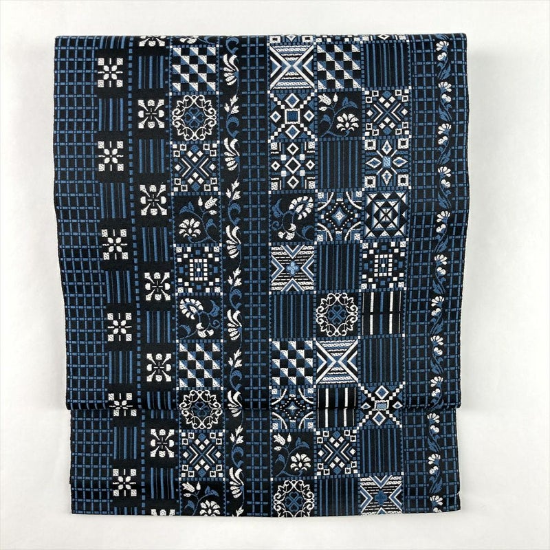 (中古)名古屋帯 黒 カジュアル 松葉仕立て 織り 幾何学 花草文 絹
