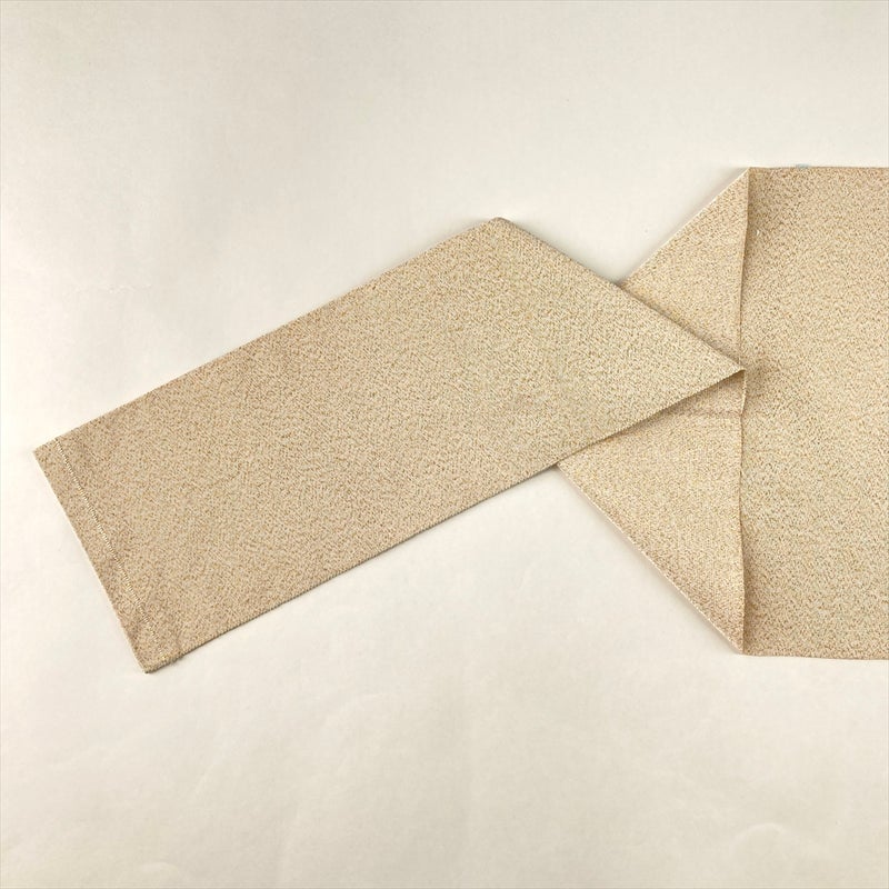 白地に金の糸がきらりと上品に映える、綴れ織りの八寸名古屋帯です。