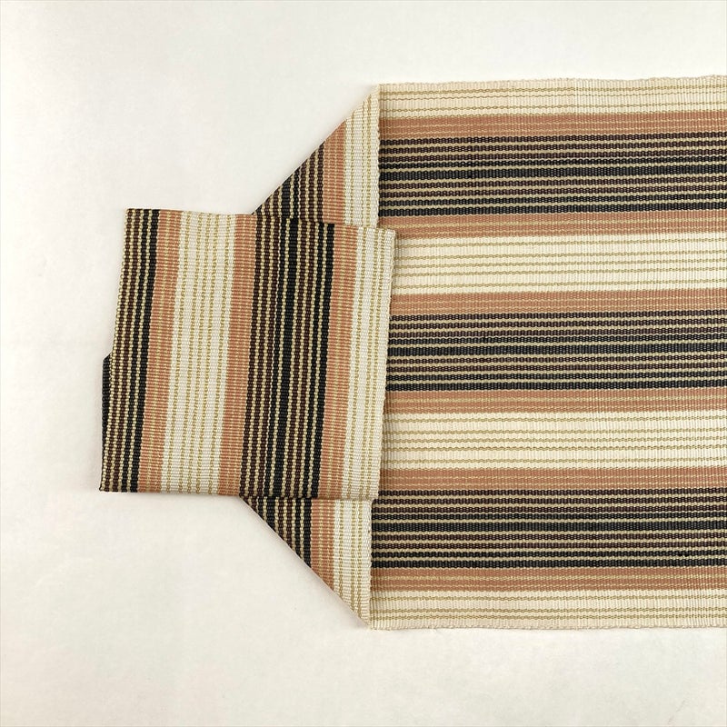 生成地に、金・薄オレンジ・黒の縦縞と組織文様が映える八寸名古屋帯。