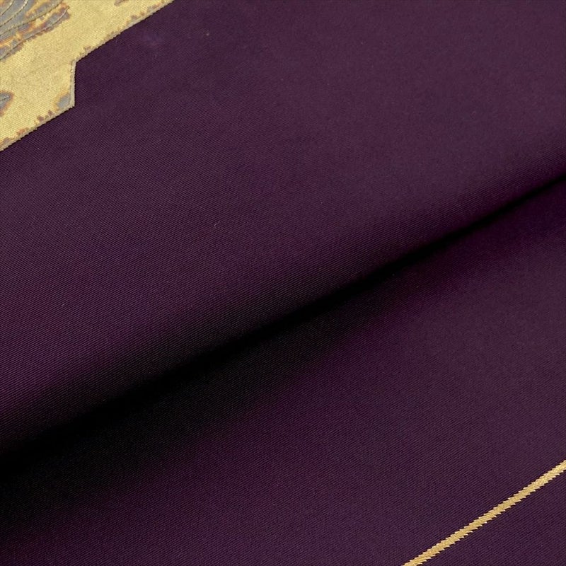 深みのある濃い紫色地に、いぶし金の波模様が印象的な、正絹の染め名古屋帯です。