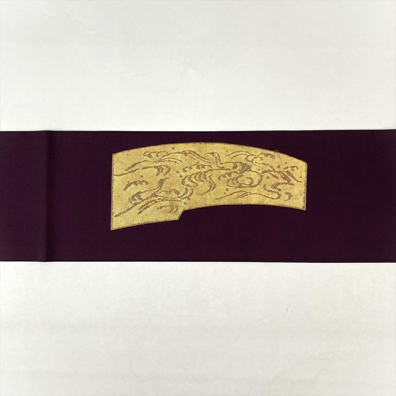 (中古)名古屋帯 紫色 カジュアル 名古屋仕立て 染め 塩瀬 金彩 切り嵌め 波 絹