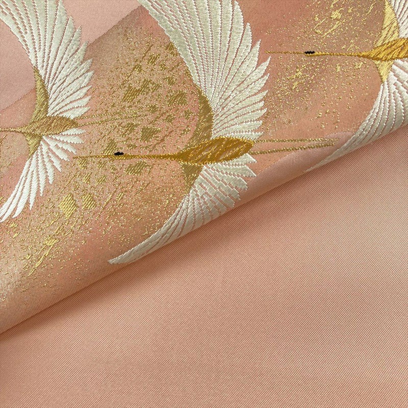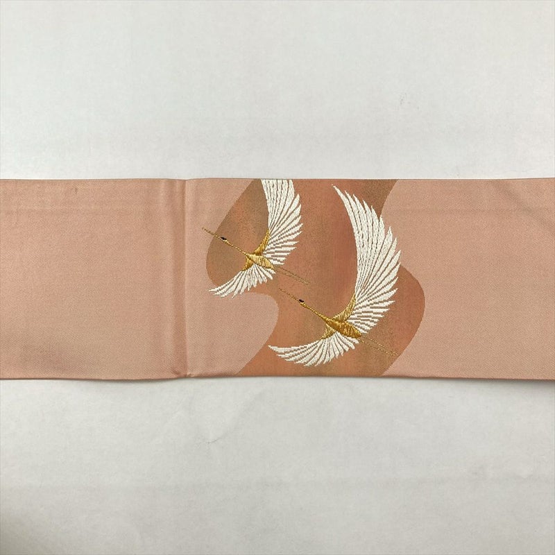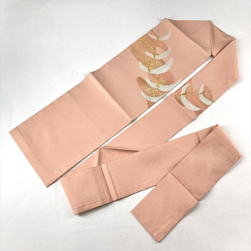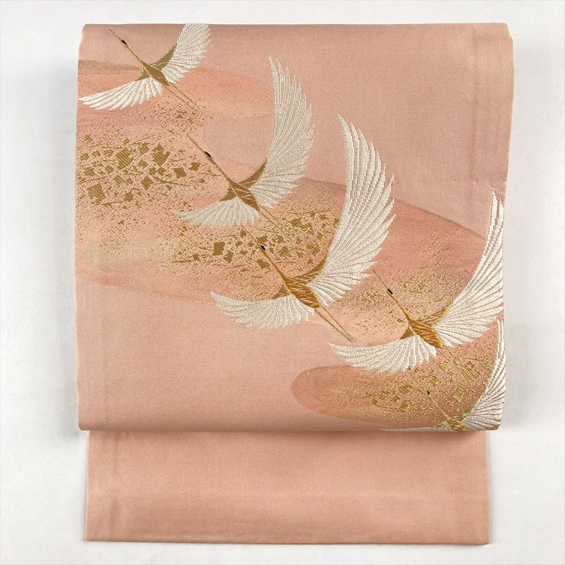 薄珊瑚色の地に、金糸で織り出された鶴が優雅に舞う、正絹の名古屋帯です。