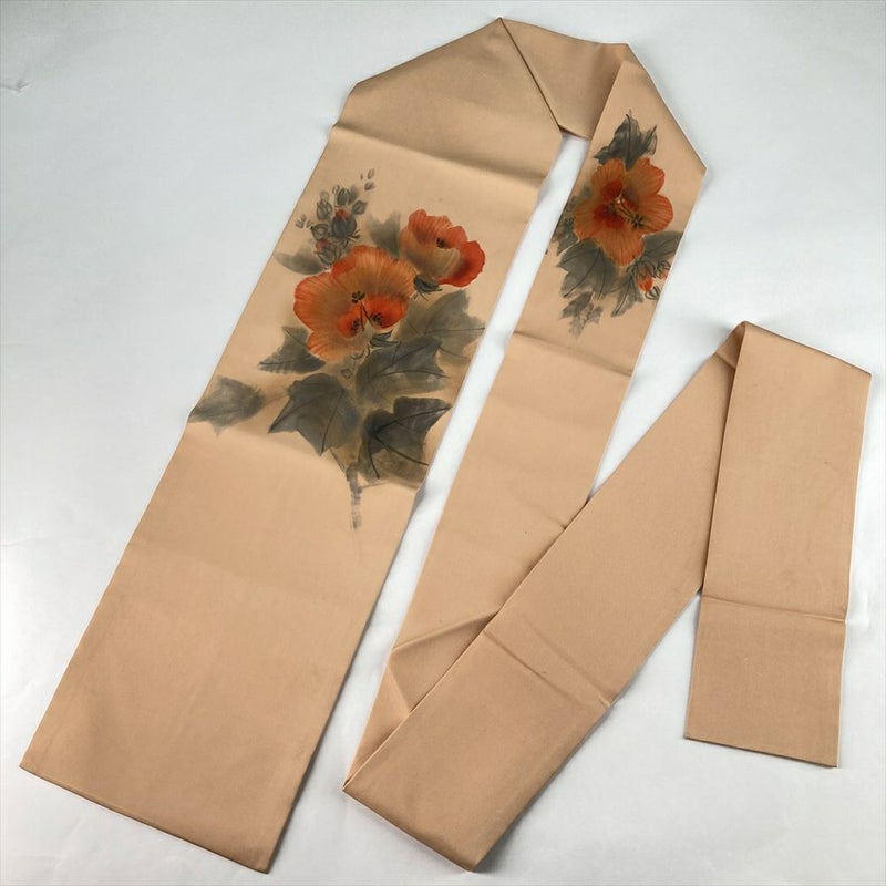 淡い橙色の塩瀬地に、大輪の花が咲き誇る染め名古屋帯。