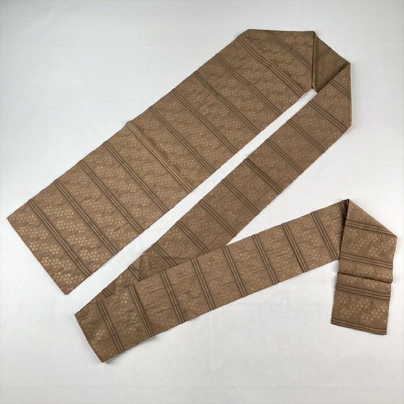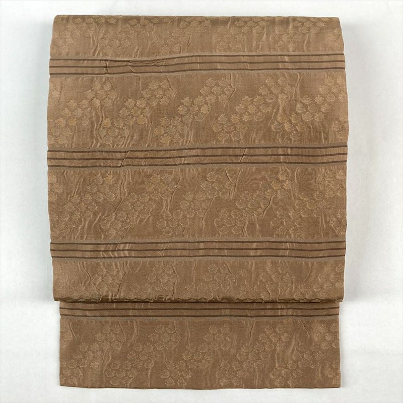 (中古)名古屋帯 薄茶色 カジュアル 名古屋仕立て ふくれ織り 金糸 梅 絹