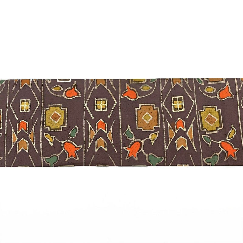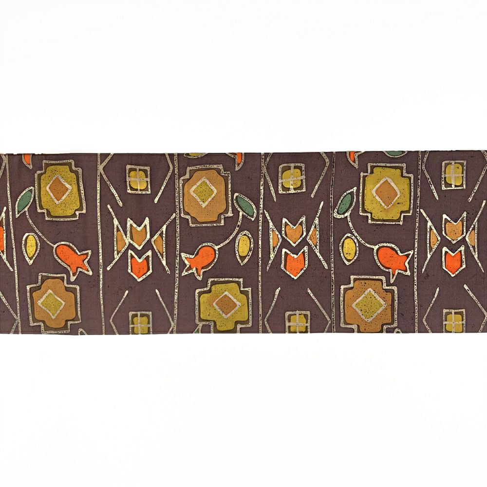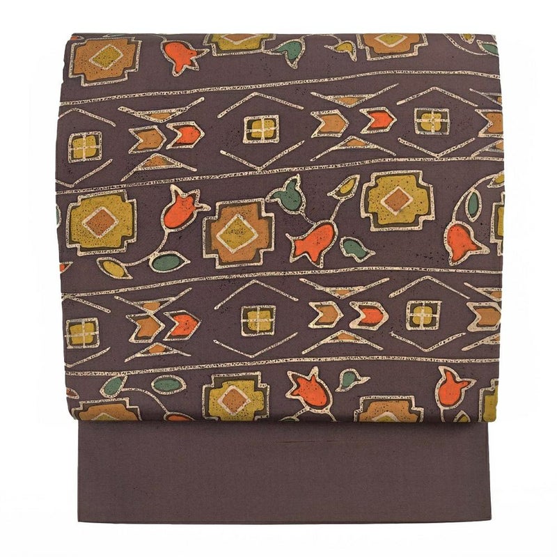 (中古)名古屋帯 焦げ茶 カジュアル 名古屋仕立て 織り ろうけつ染め調 幾何学柄