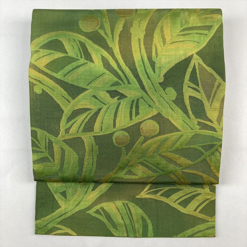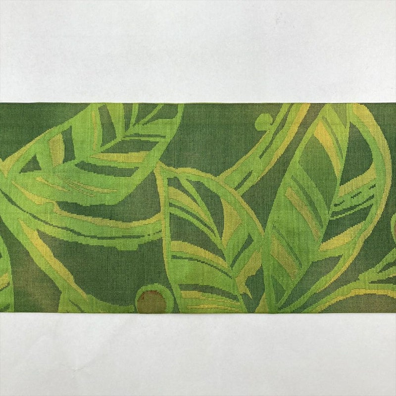(中古)名古屋帯 緑色 カジュアル 名古屋仕立て 織り 植物