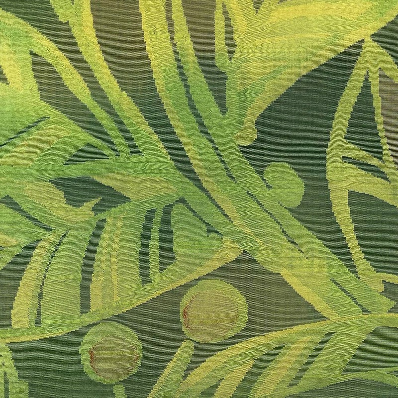 ライムグリーンの植物柄の名古屋帯は、まるで春の息吹を感じさせるような、爽やかな一枚。白や薄いピンクの小紋に合わせれば、可愛らしい雰囲気に。 無地の紬と合わせると、カジュアルながらも上品なコーディネートが完成します。