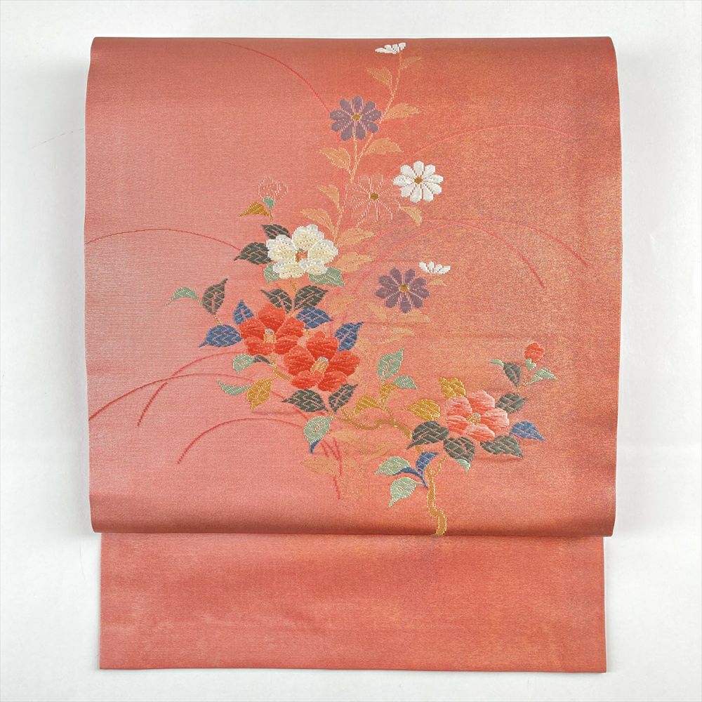 (中古)名古屋帯 ピンク 珊瑚色 セミフォーマル カジュアル 名古屋仕立て 織り 切箔 金糸 椿 菊