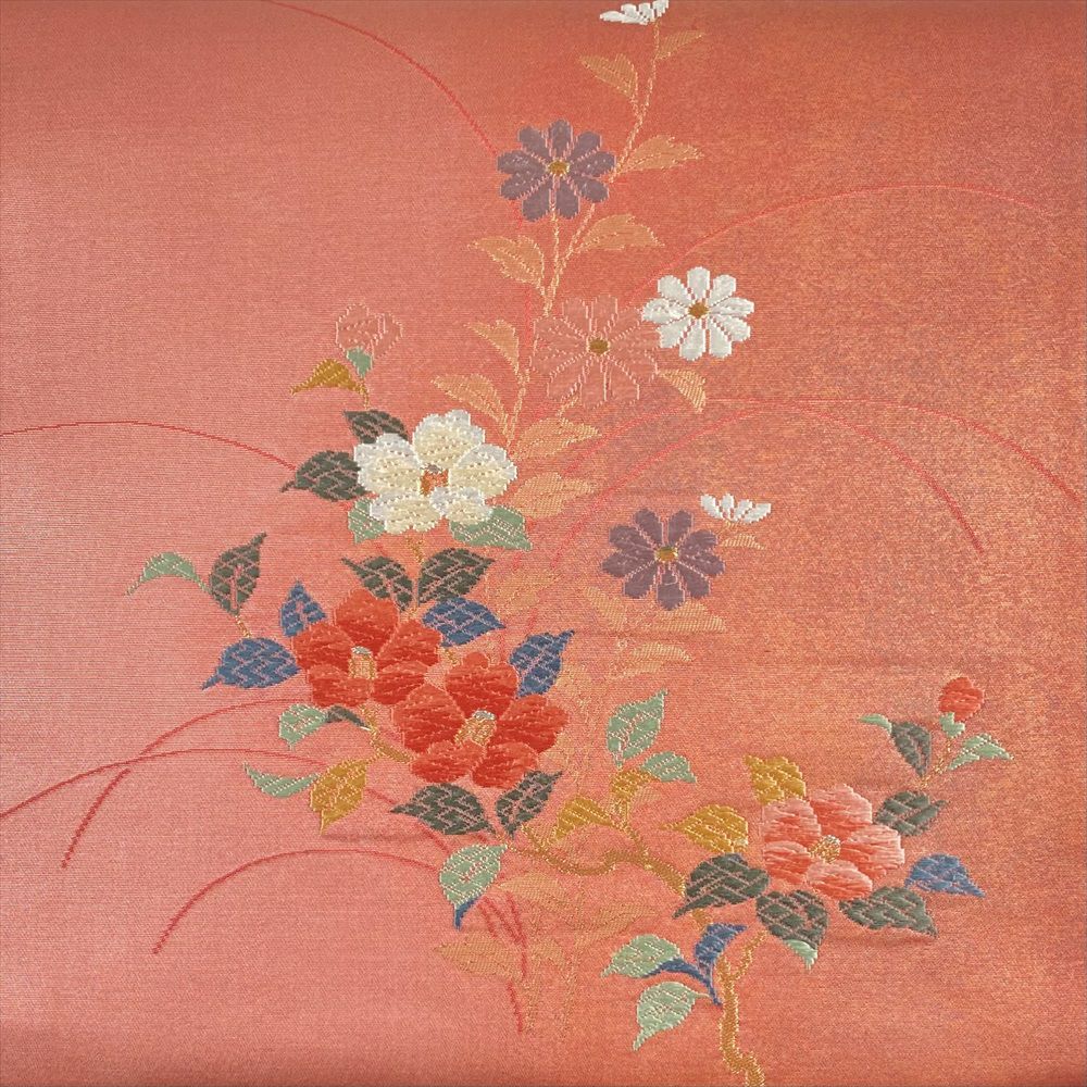 【色柄】ピンク 珊瑚色 セミフォーマル カジュアル 切箔 金糸 椿 菊 織り