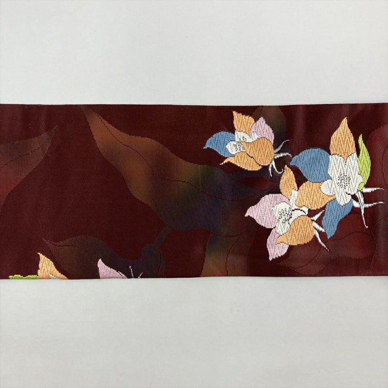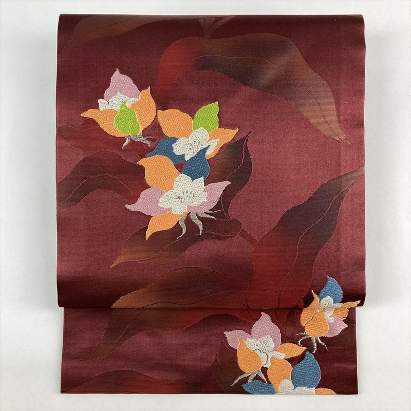 (中古)名古屋帯 赤 臙脂色 カジュアル 名古屋仕立て 金糸 色糸 花葉