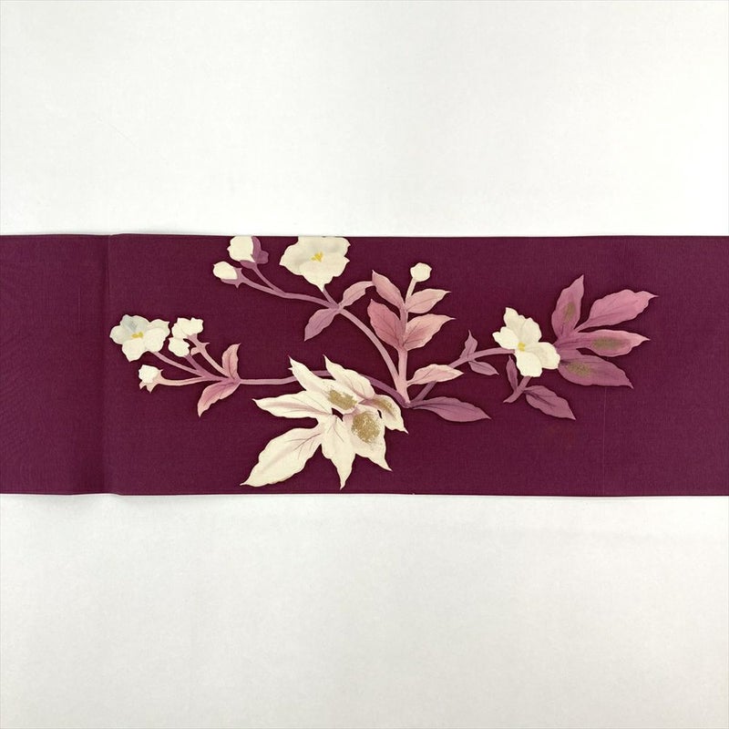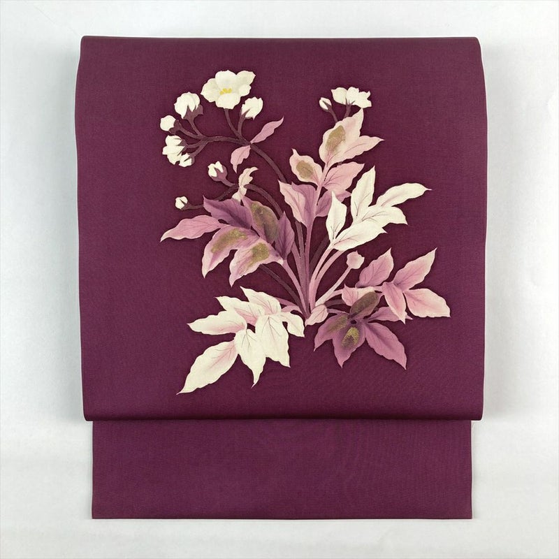 (中古)名古屋帯 紫 小豆色 カジュアル 名古屋仕立て 塩瀬 染め 金彩 花葉