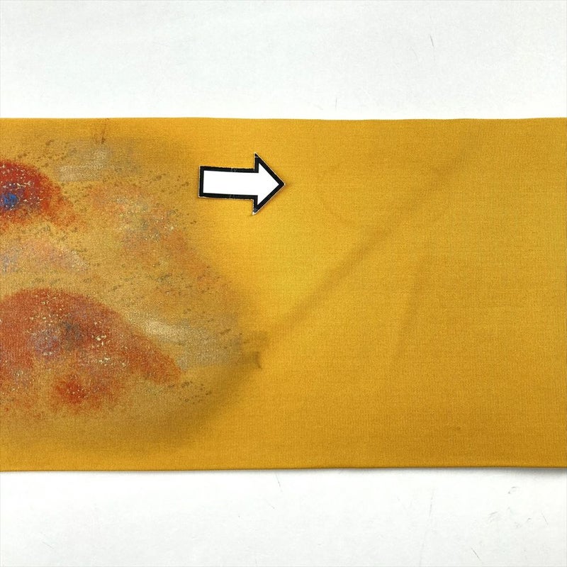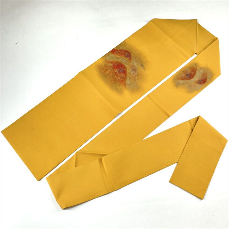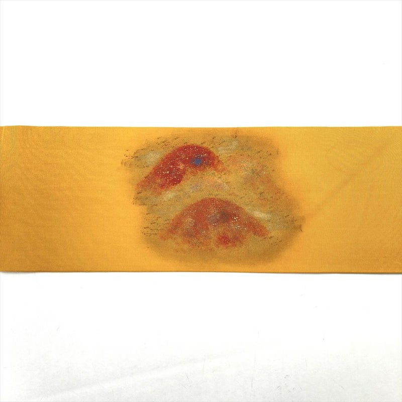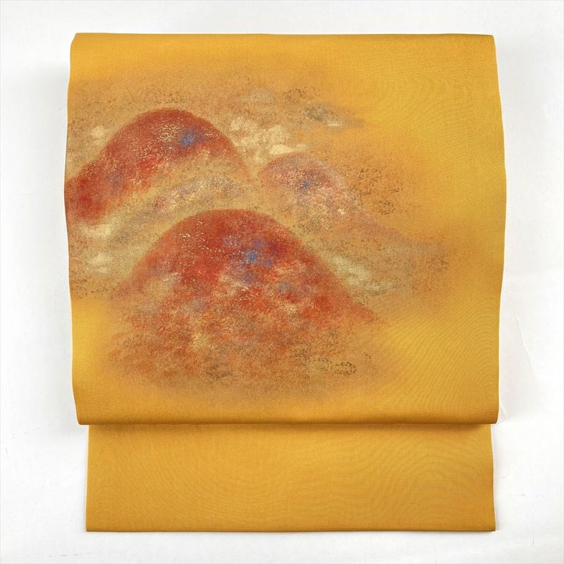 (中古)名古屋帯 山吹色 オレンジ カジュアル 名古屋仕立て 塩瀬 染め 金彩 霞 山並み