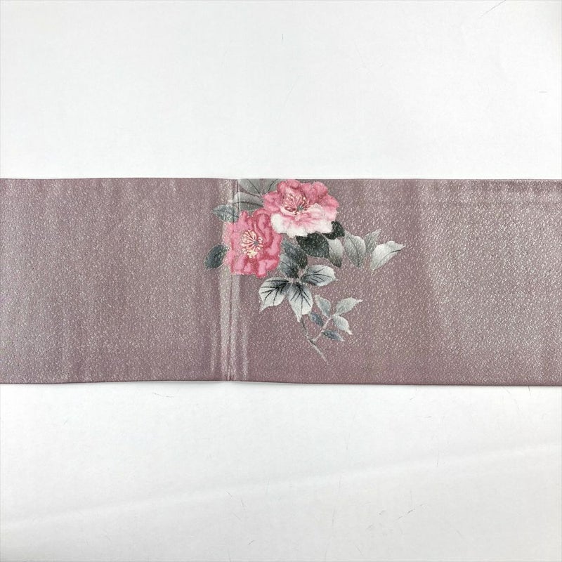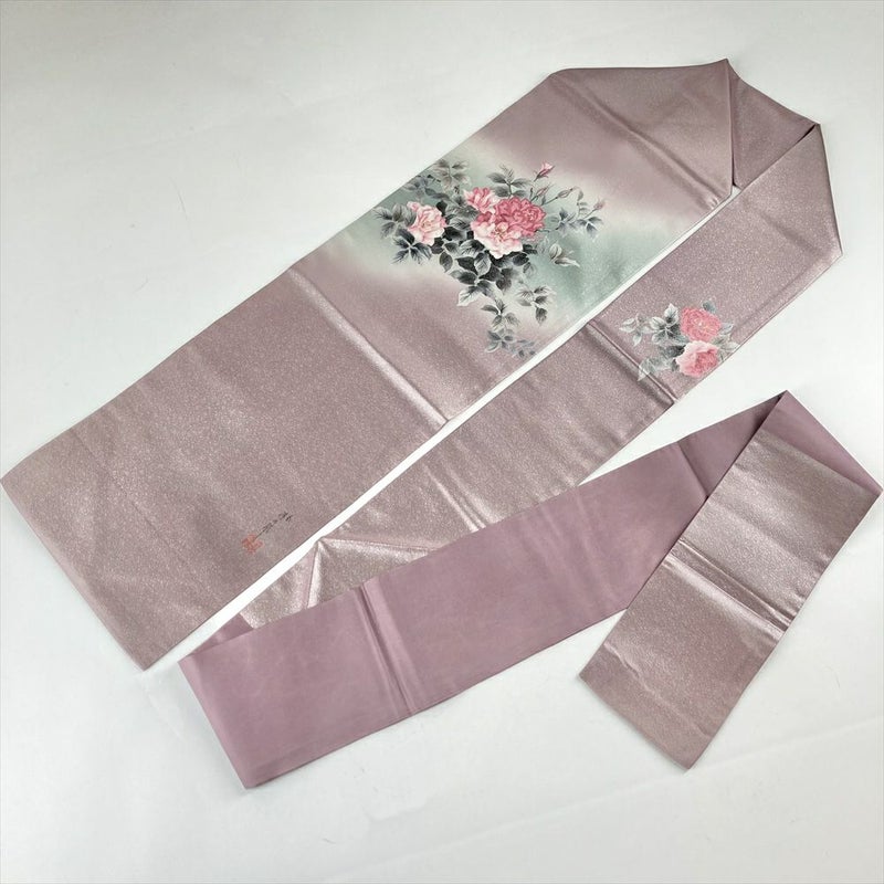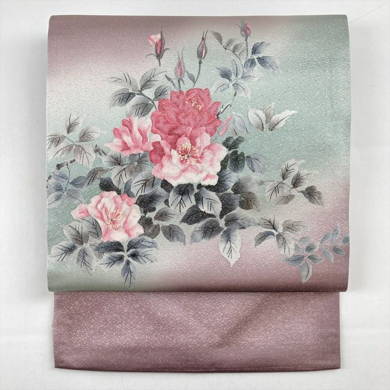(中古)名古屋帯 灰紫 セミフォーマル カジュアル 名古屋仕立て 織り 染め 銀糸 牡丹