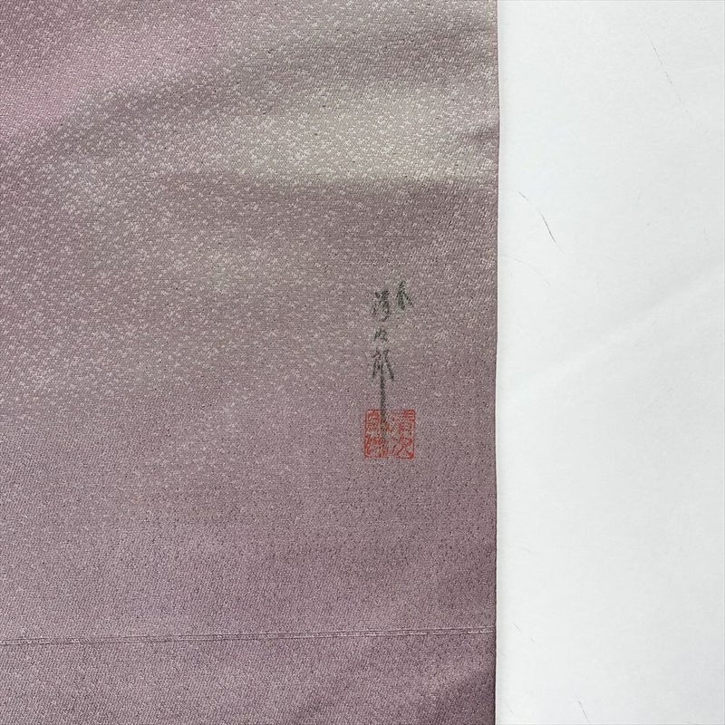 生地には程よい張りと柔らかさがあります。上品な色合いに格調ある柄の帯は装いが品よくまとまります。手先、裏地にプレス跡がございます。保存臭がややございます。たれに落款がございます