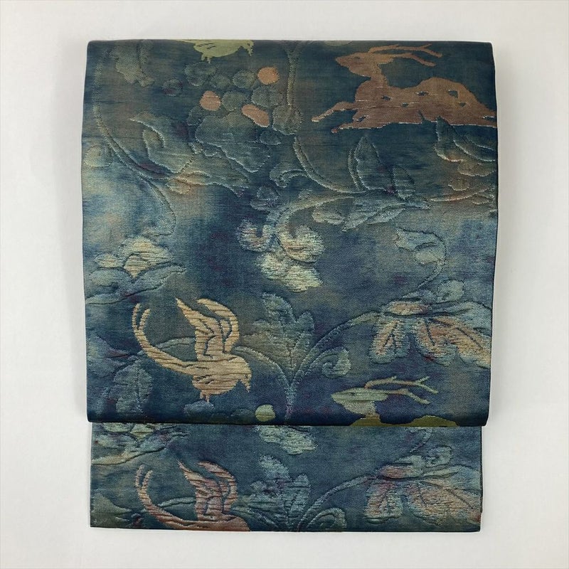 (中古)名古屋帯 青緑 カジュアル 平仕立て ふくれ織り切箔 唐草 鹿と鳥