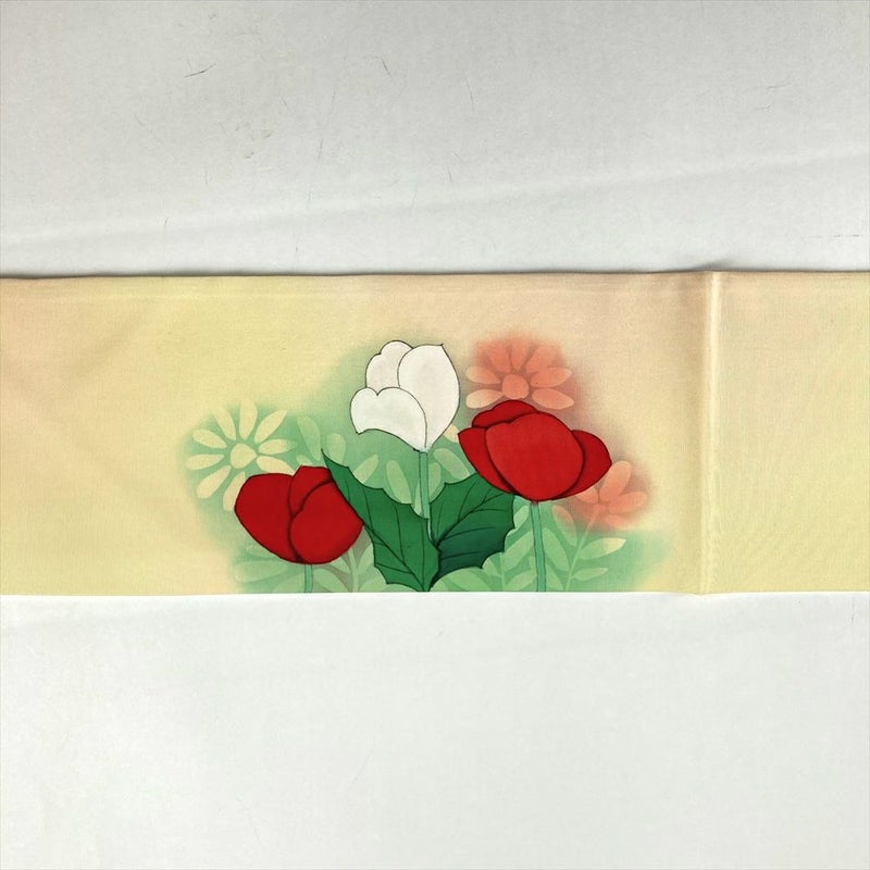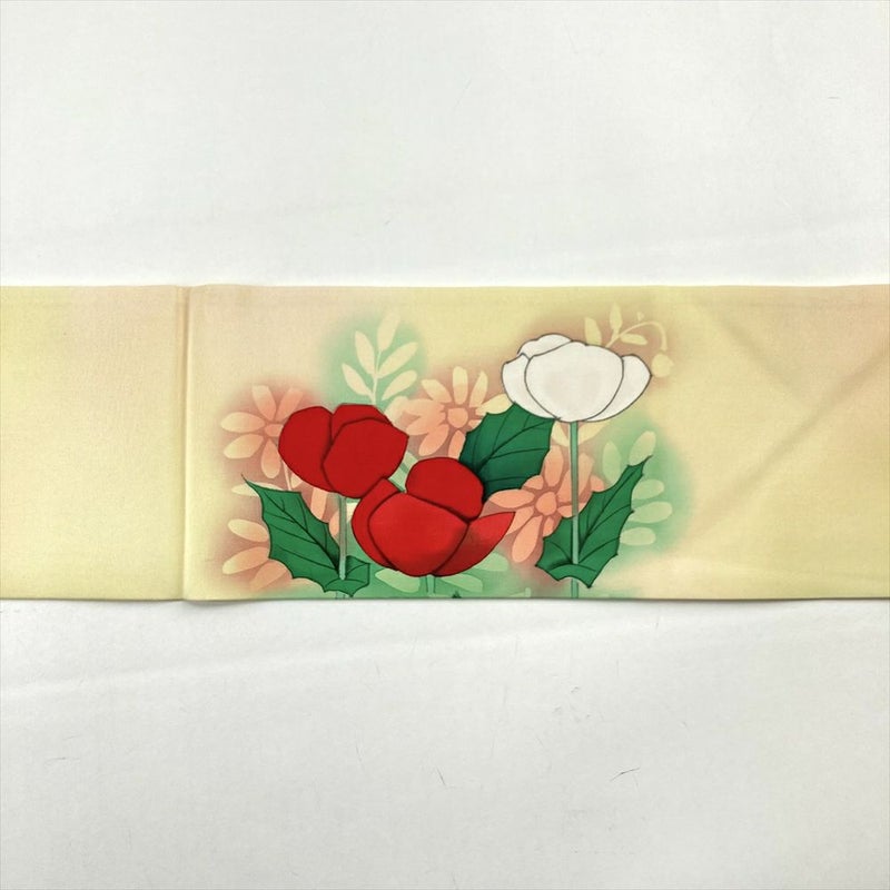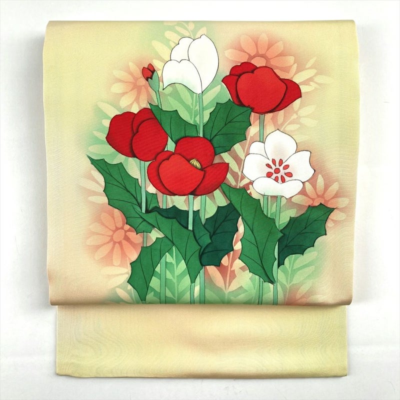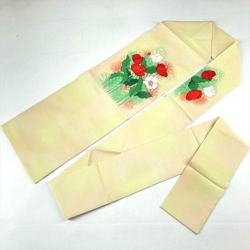 (中古)名古屋帯 薄黄色 カジュアル 名古屋仕立て 塩瀬 染め 花葉 グラデーション