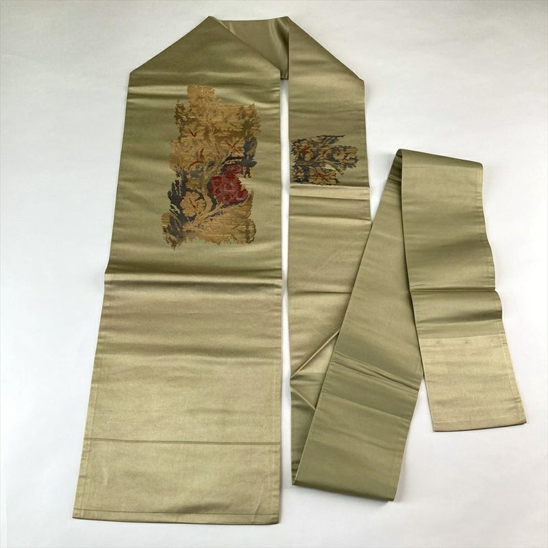 (中古)名古屋帯 金緑 カジュアル 名古屋仕立て 織り 草花文様 絹