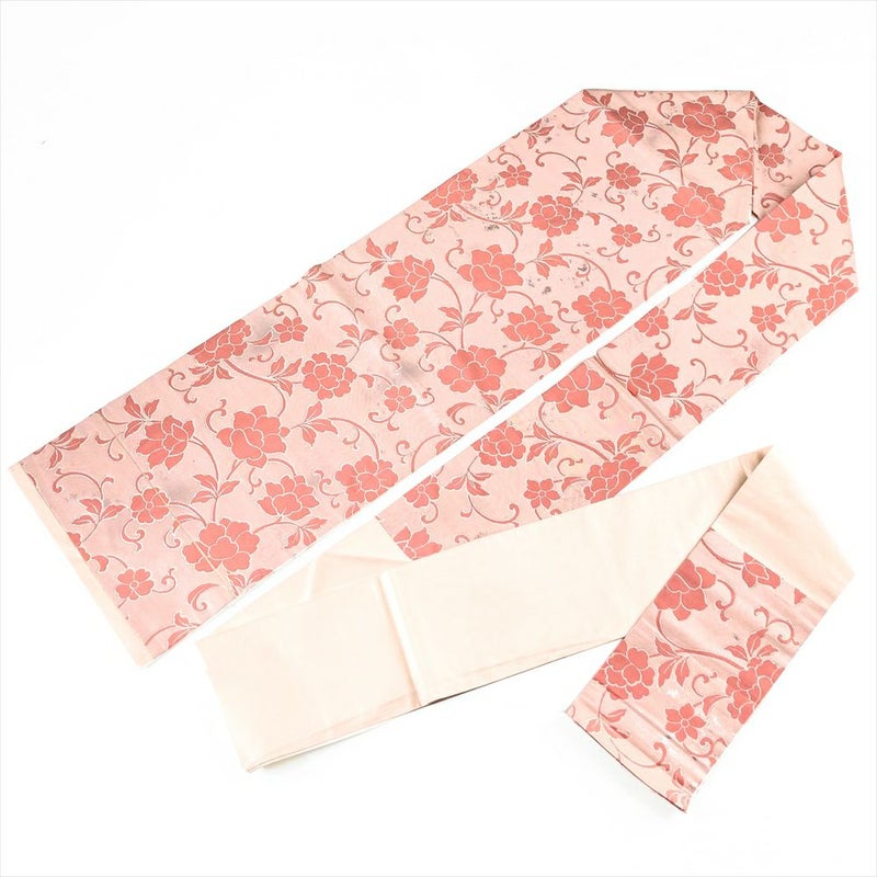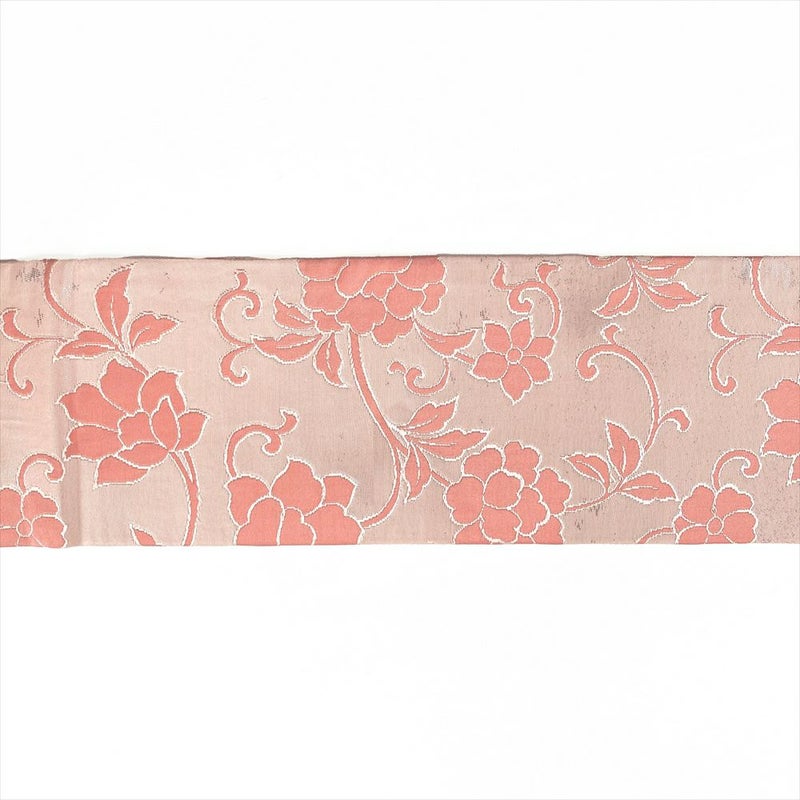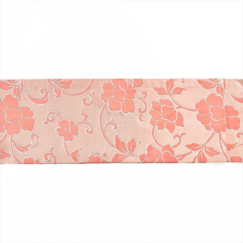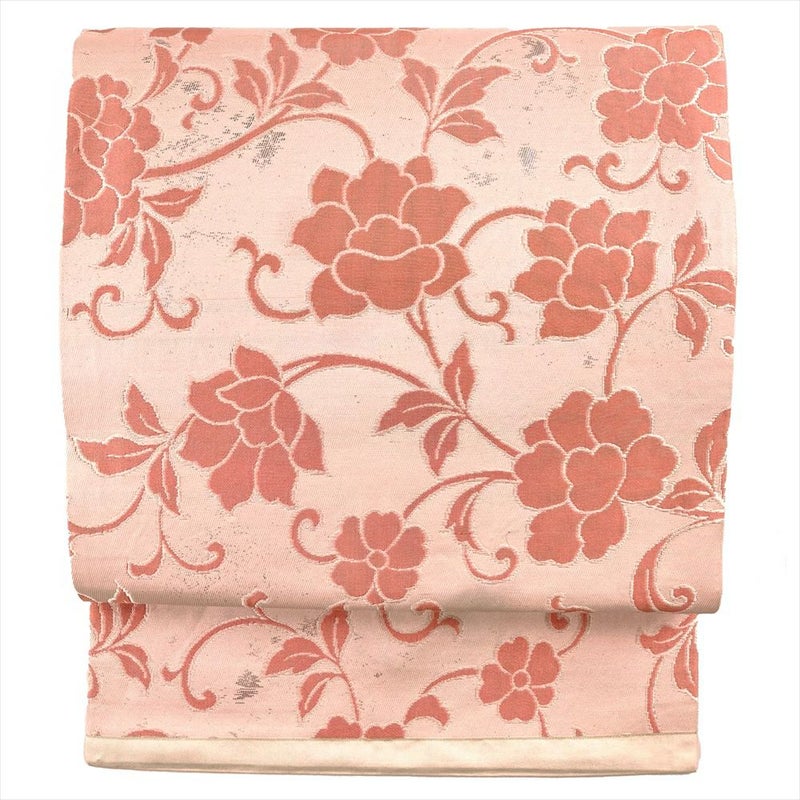 (中古)名古屋帯 薄ピンク セミフォーマル カジュアル 名古屋仕立て 織り 銀彩 牡丹唐草