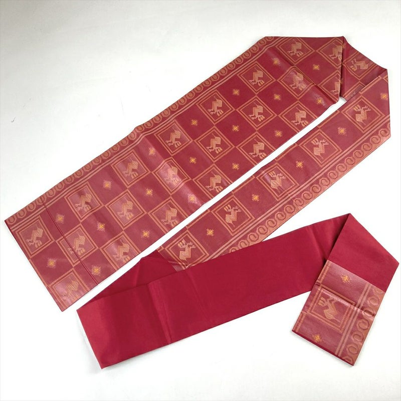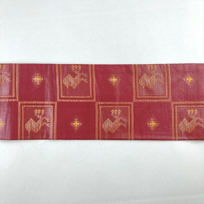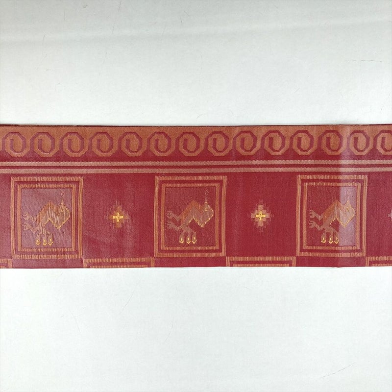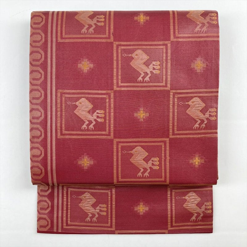(中古)名古屋帯 赤 カジュアル 名古屋仕立て 織り うるし箔調 鳥 コプト柄