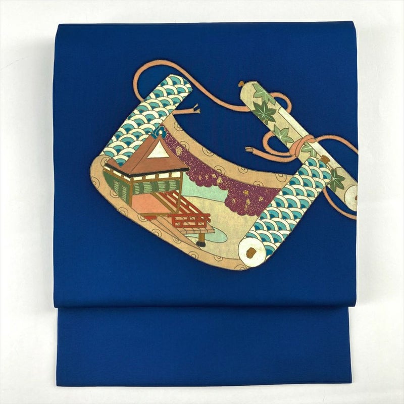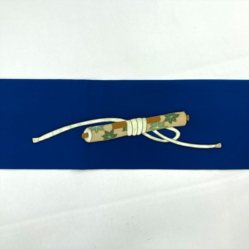 (中古)名古屋帯 青 カジュアル 名古屋仕立て 塩瀬 染め 金彩 絵巻物