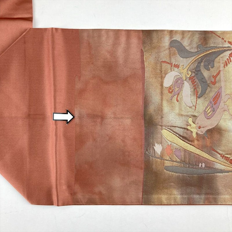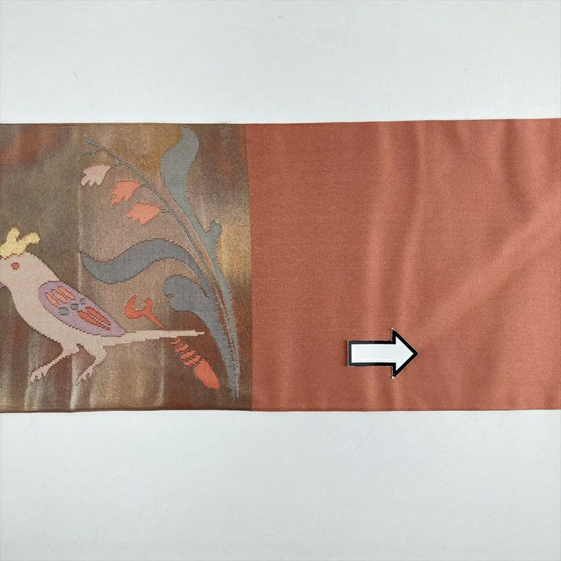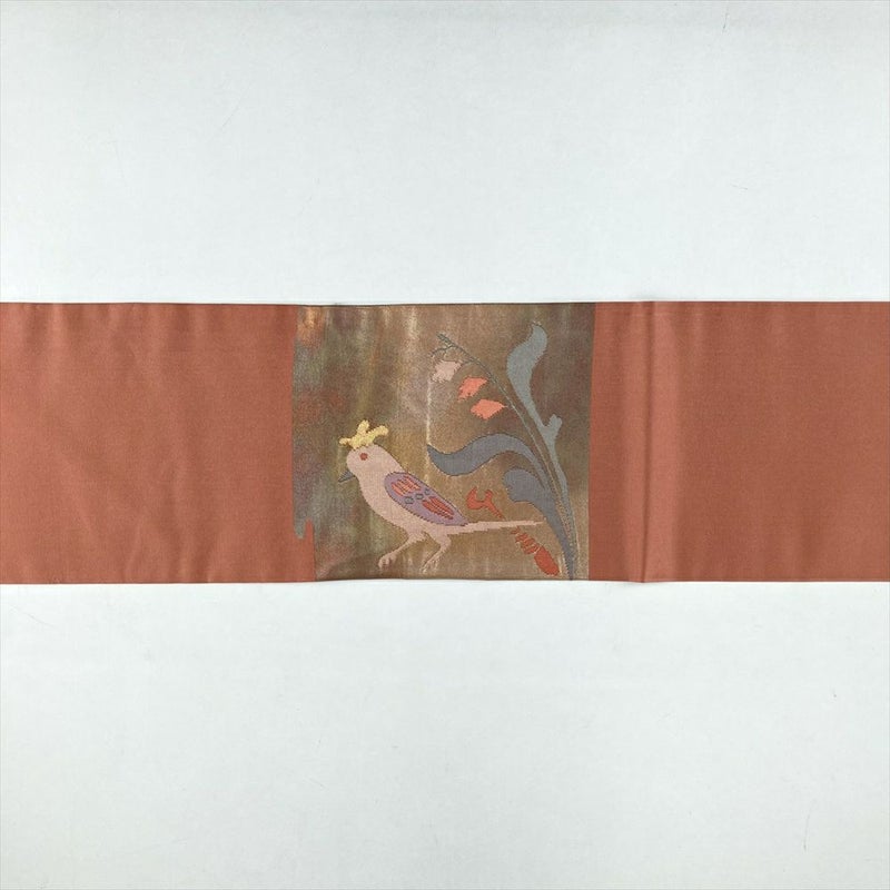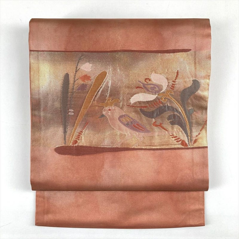 (中古)名古屋帯 紅梅 ピンク カジュアル 名古屋仕立て 織り 切箔 金糸 花鳥