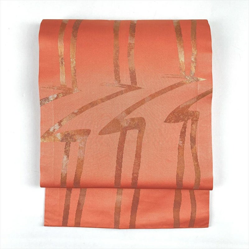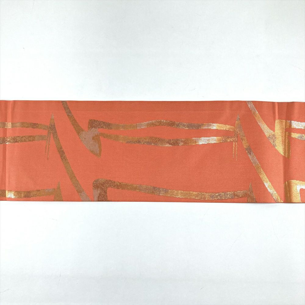 (中古)名古屋帯 珊瑚色 ピンク カジュアル 名古屋仕立て 織り 切箔 抽象柄