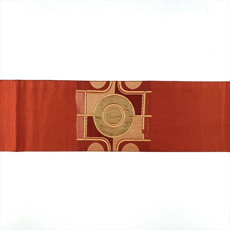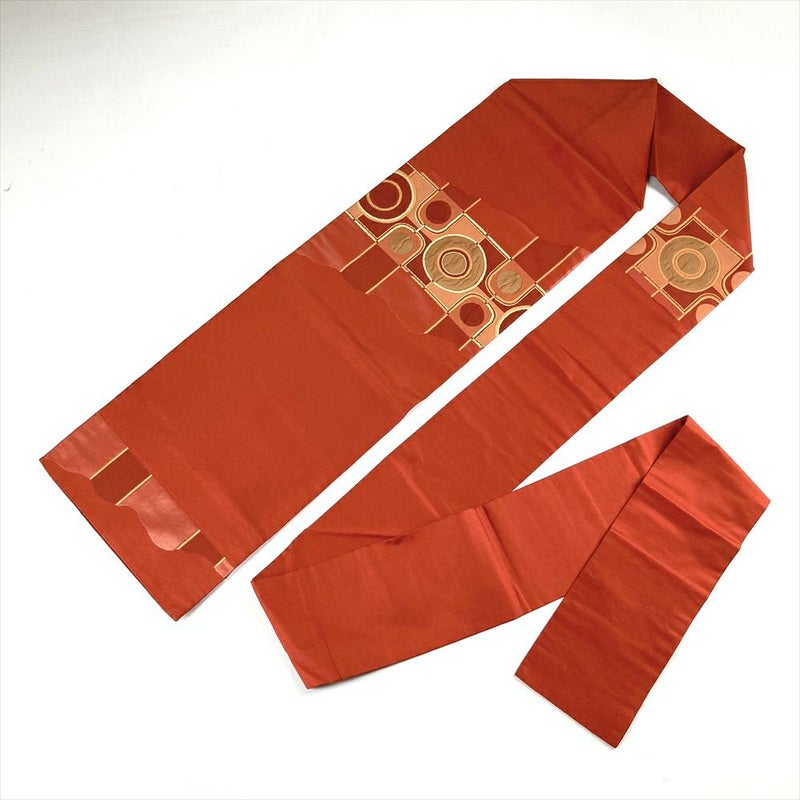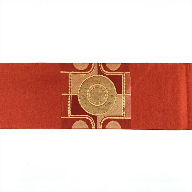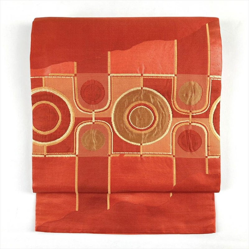 (中古)名古屋帯 朱赤 オレンジ カジュアル 名古屋仕立て ふくれ織り うるし箔調 抽象柄