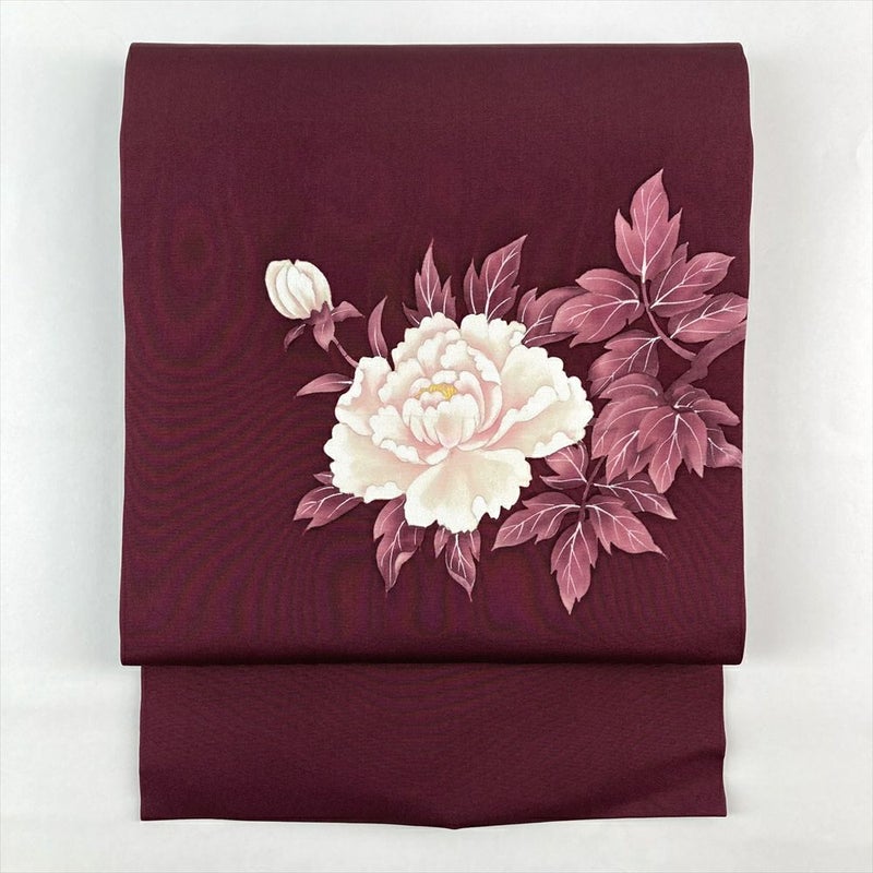 牡丹の華やかな美しさと凛とした佇まい、どこか惹かれる魅力を感じませんか?この帯も、まるで牡丹のように、あなたの装いを華やかに彩ります。ふっくらとした絹の肌触りは、一日中心地よく、どんな動きにも優しく寄り添ってくれます。紬や小紋に合わせれば、普段使いしやすい着物スタイルが完成します。ちょっとしたお出かけや、友人とのランチなど、様々なシーンで活躍してくれるでしょう。保存臭がややございます。太鼓、前柄に汚れがございます。