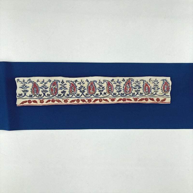 (中古)名古屋帯 濃青 カジュアル 名古屋仕立て 塩瀬 染め 更紗 植物 オリエンタル柄