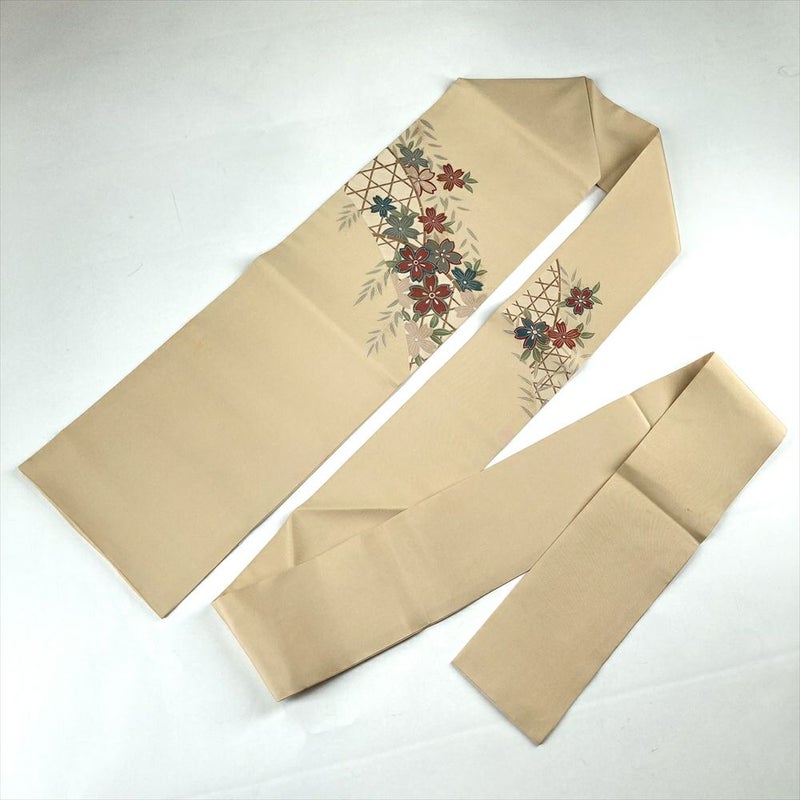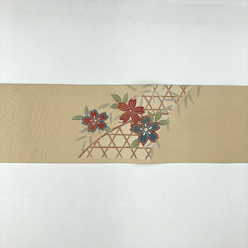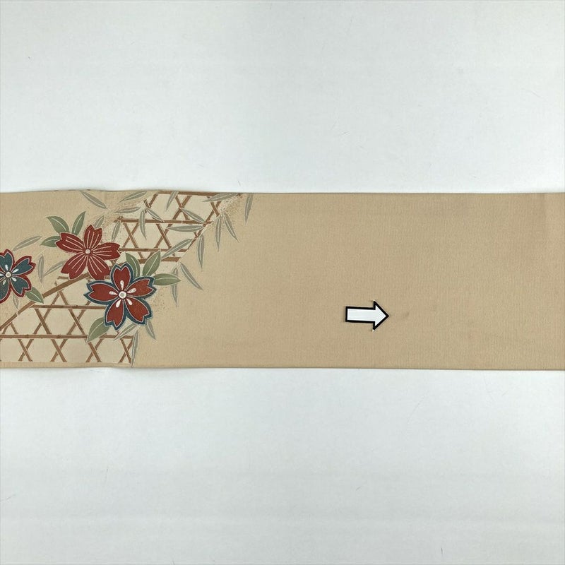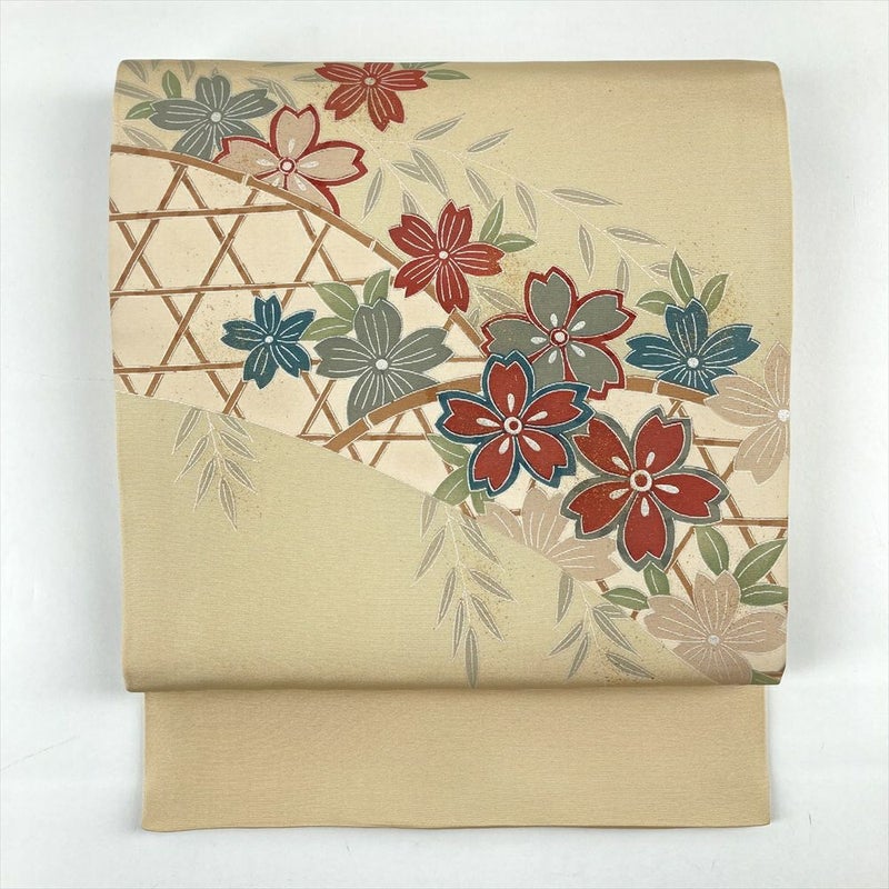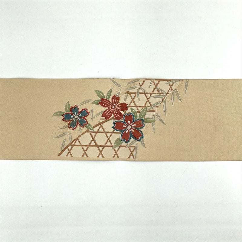 (中古)名古屋帯 ベージュ カジュアル 名古屋仕立て 塩瀬 染め 金彩 銀彩 花葉 蛇篭