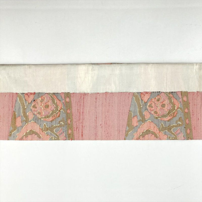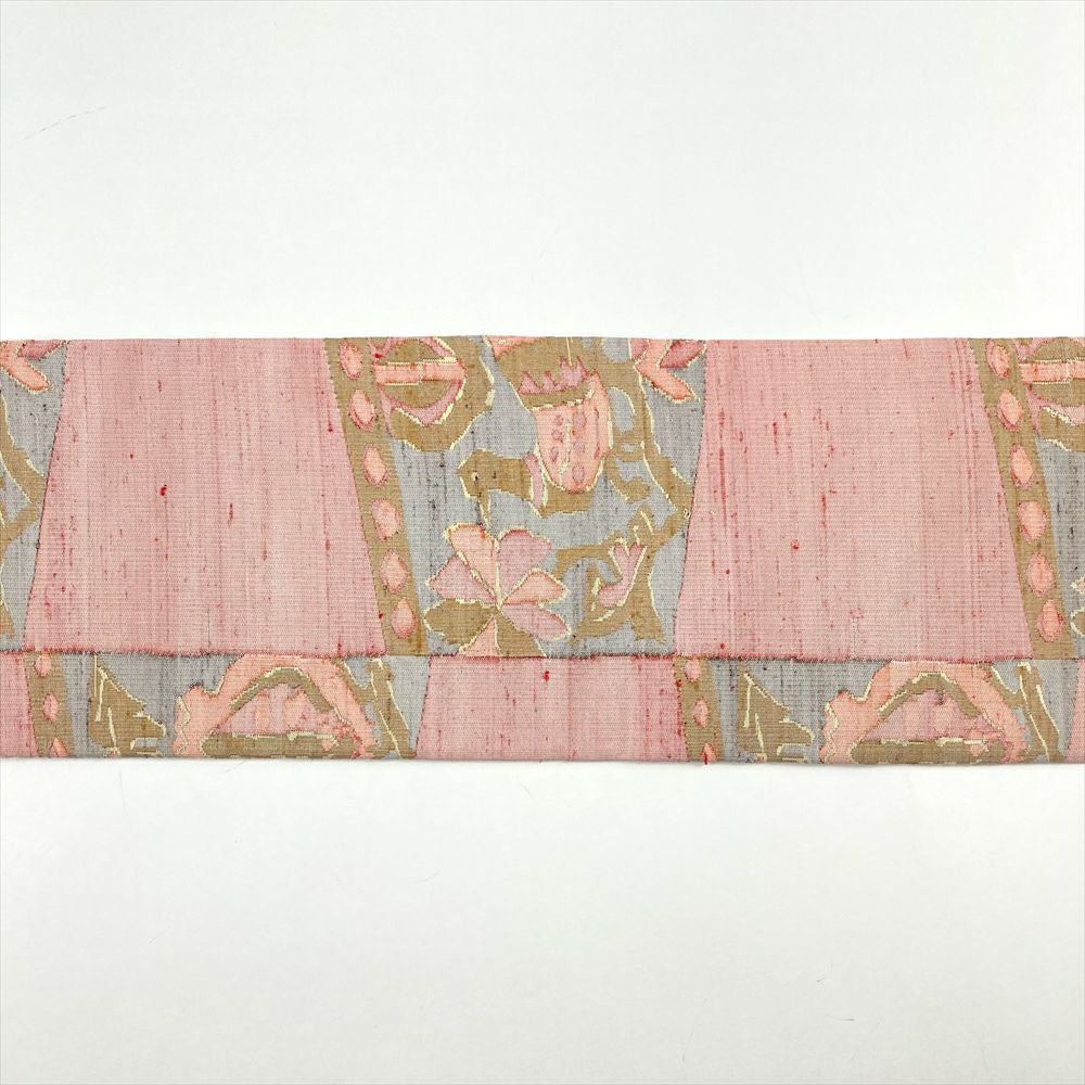 (中古)名古屋帯 赤紫 生成り カジュアル 名古屋仕立て 織り 花鳥 幾何学柄