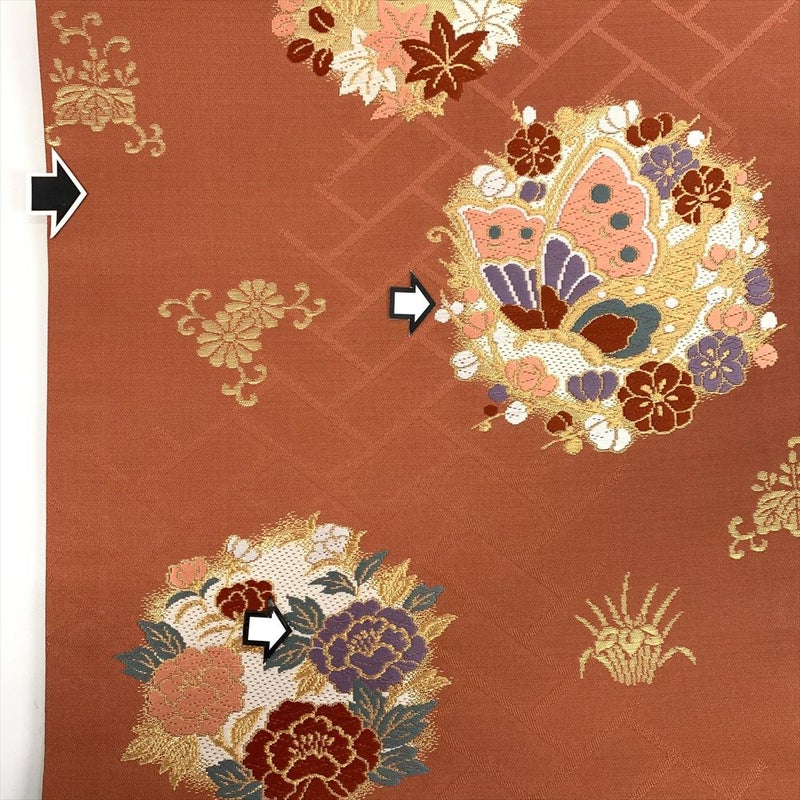 【状態ランクA】表地の前柄に糸浮き、お太鼓柄に擦れと糸浮き、裏地のたれ先に汚れ。保存臭あり