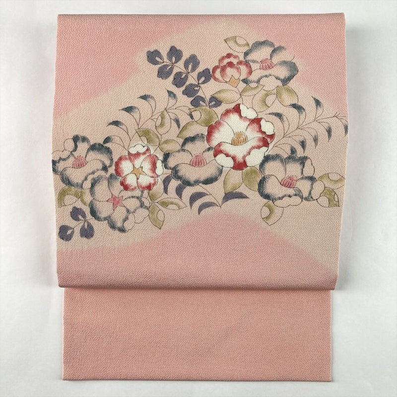 ピンクの縮緬地に、愛らしい椿を染め上げた名古屋帯。