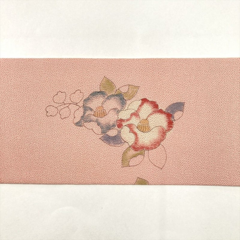 (中古)名古屋帯 ピンク カジュアル 名古屋仕立て 縮緬 染め 椿 絹
