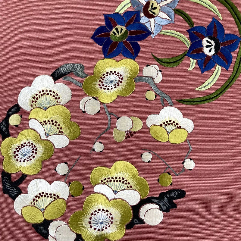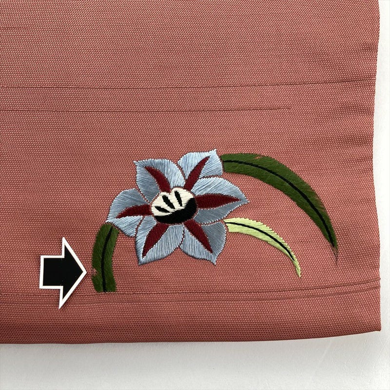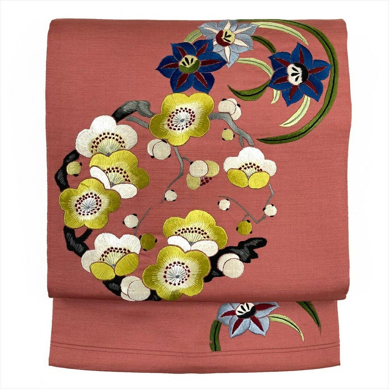 (中古)九寸名古屋帯 ピンク カジュアル 刺繍 花の丸 名古屋仕立て