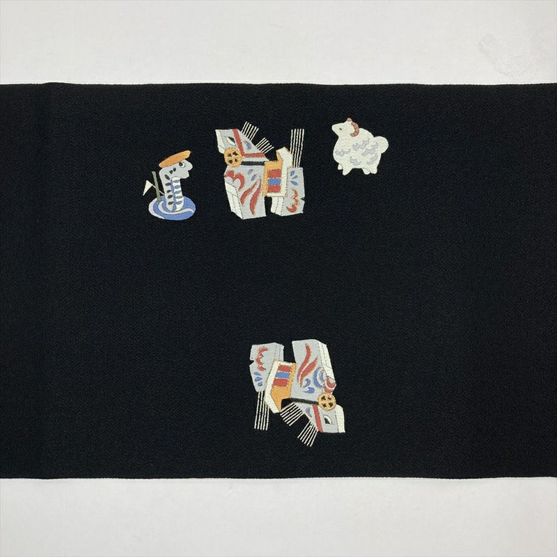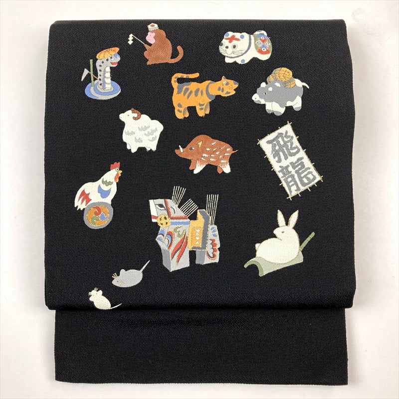 (中古)九寸名古屋帯 黒 カジュアル 縮緬 民芸品 干支尽くし 平仕立て