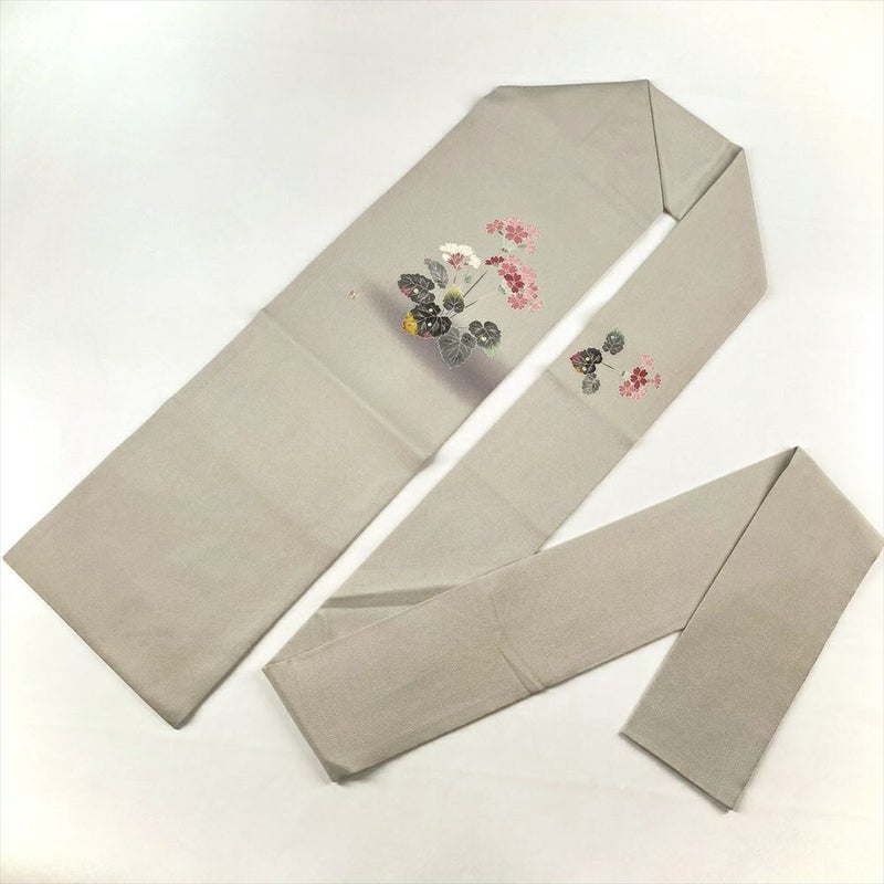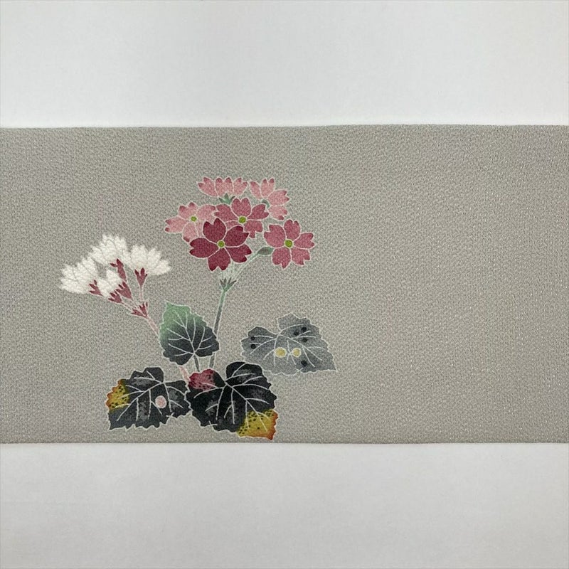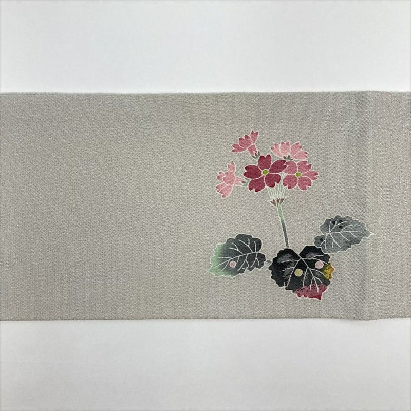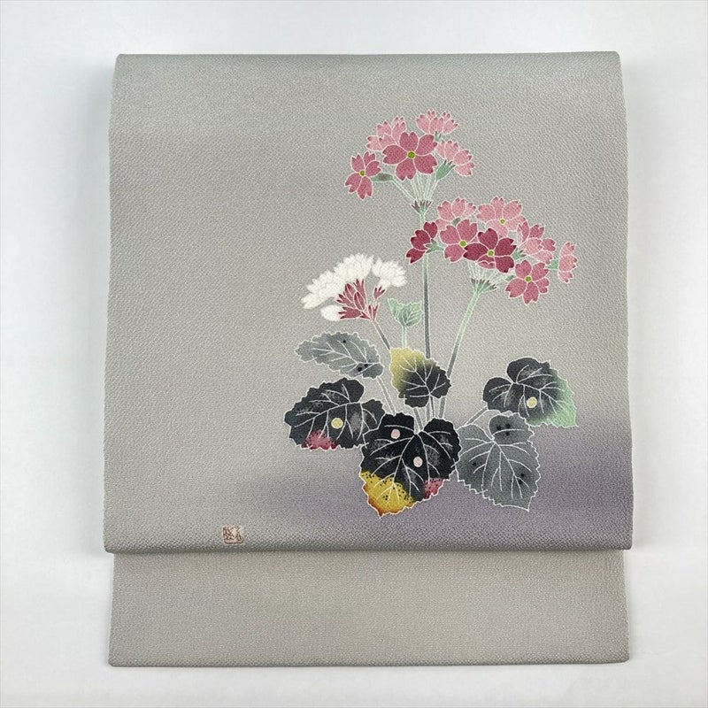 (中古)羽田登喜氏 名古屋帯 グレー 白鼠色 カジュアル 名古屋仕立て ちりめん 染め 花草