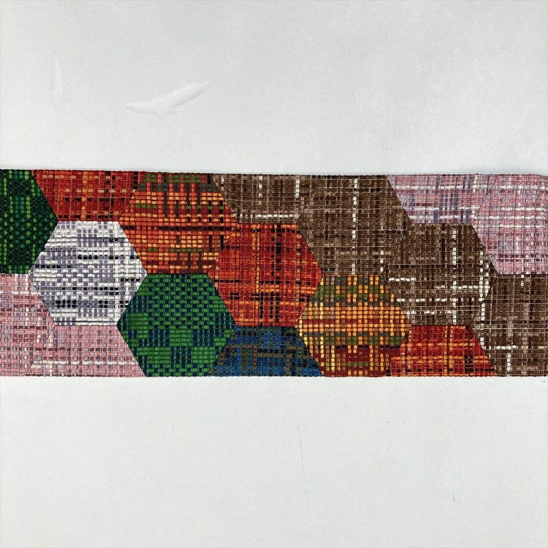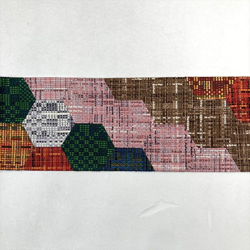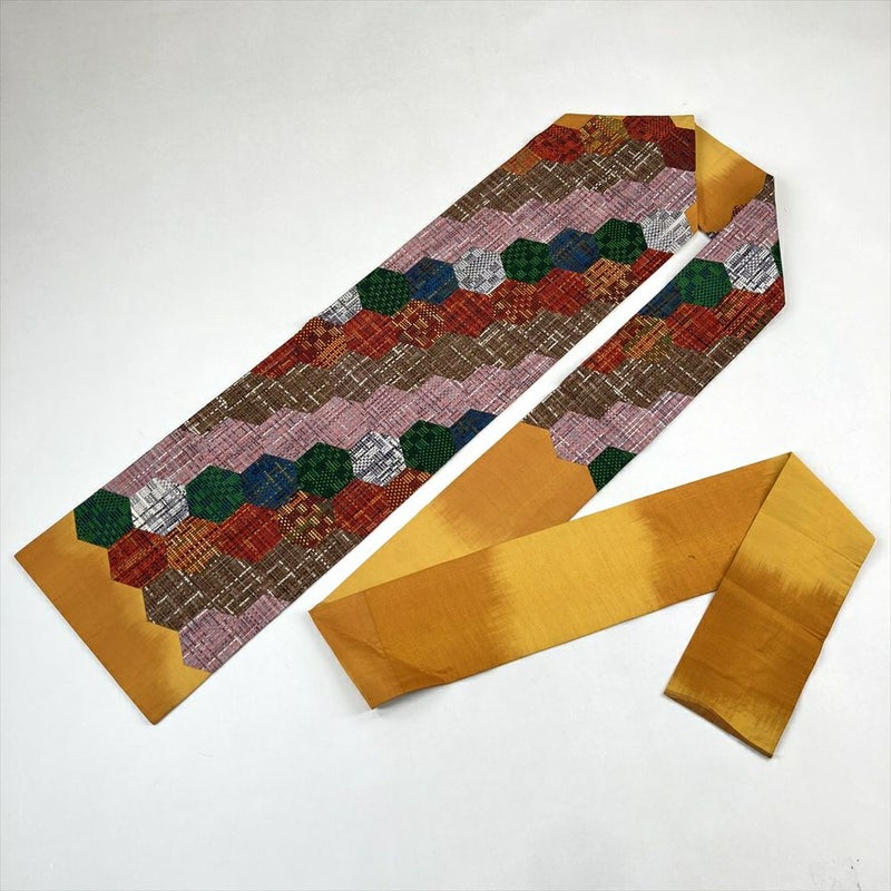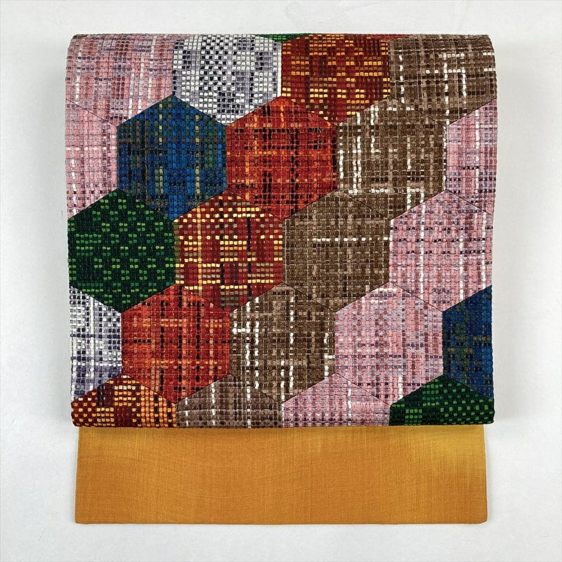 (中古)九寸名古屋帯 黄色 緑 茶 ピンク 赤 カジュアル 切り嵌め 亀甲 グラデーション
