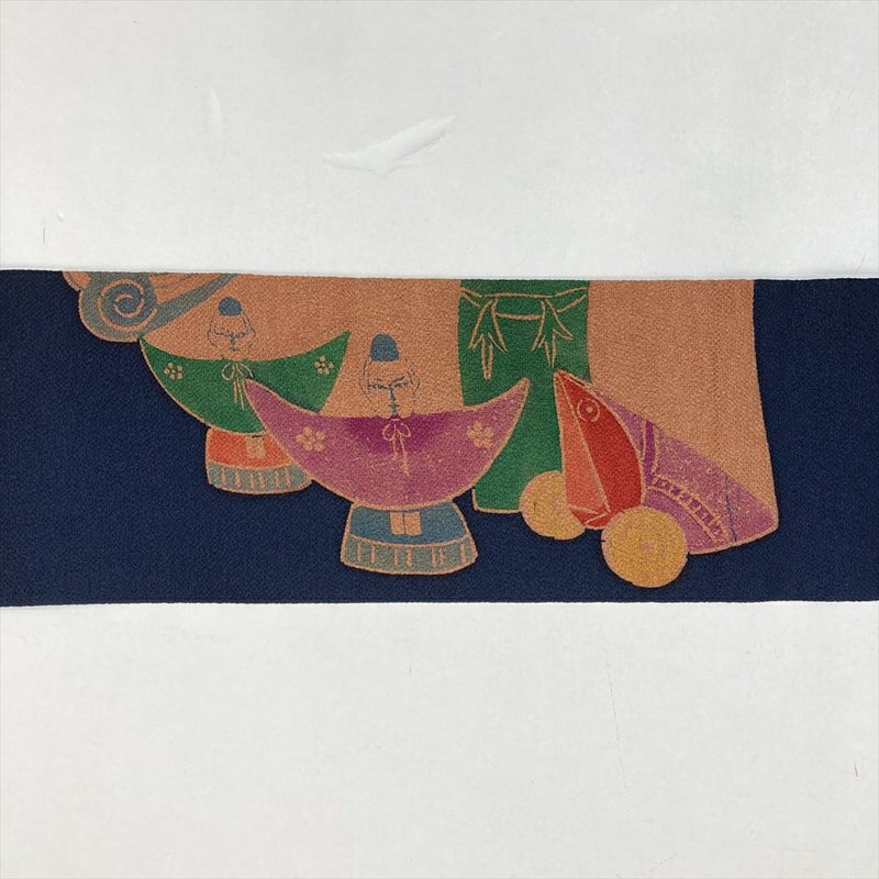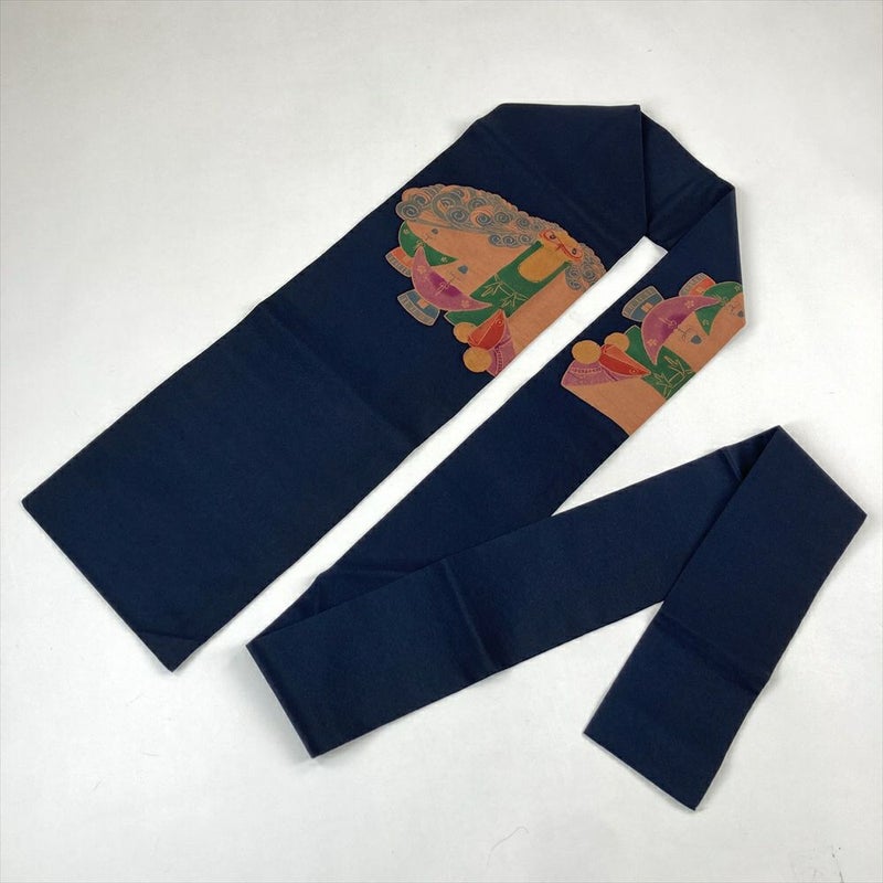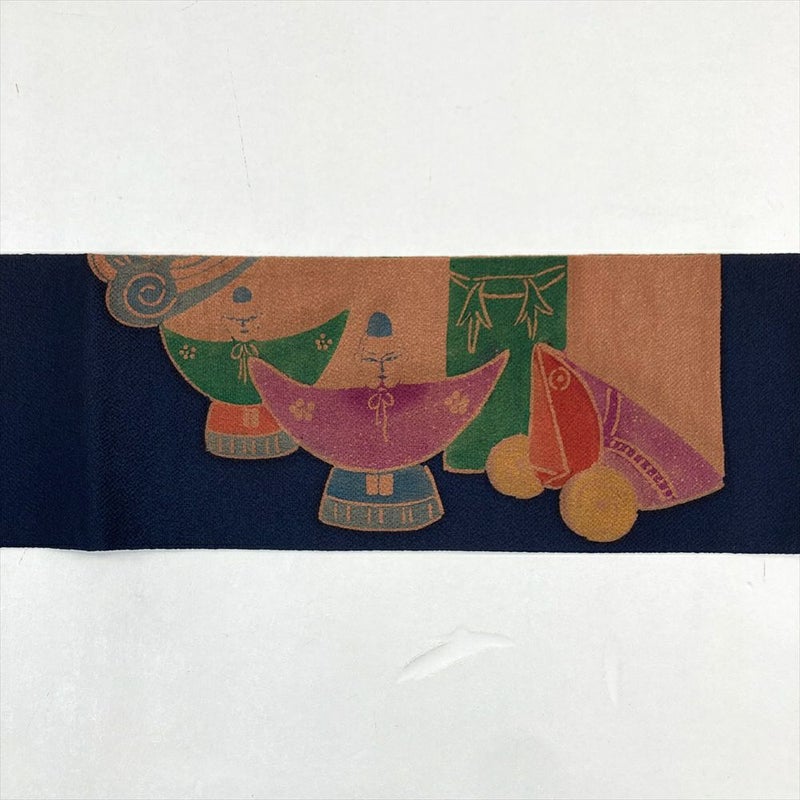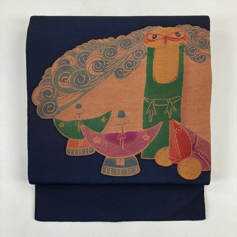 (中古)名古屋帯 濃紺 カジュアル ちりめん 型絵染め 民芸品