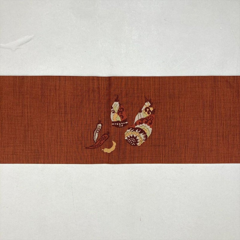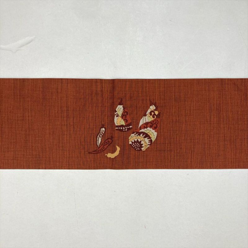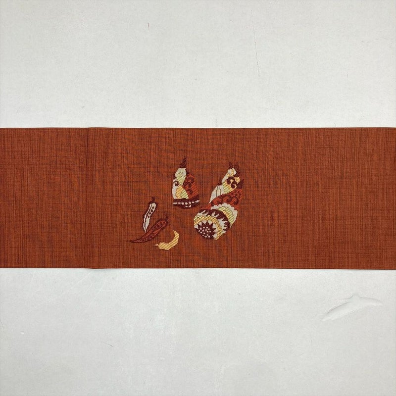 (中古)九寸名古屋帯 赤茶 カジュアル 破れ格子 野菜 たけのこ たまねぎ とうがらし えんどうまめ