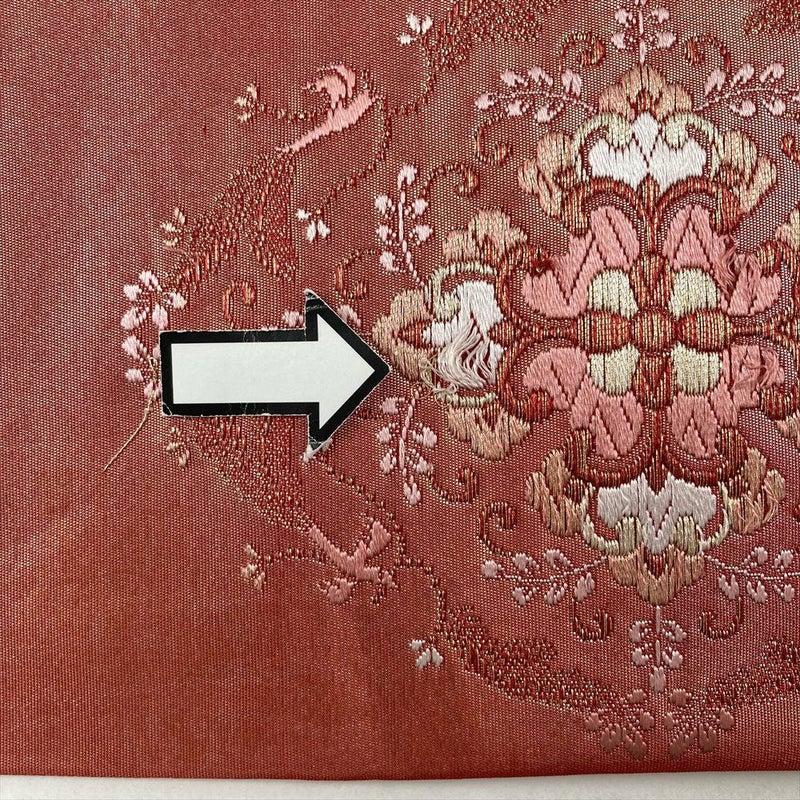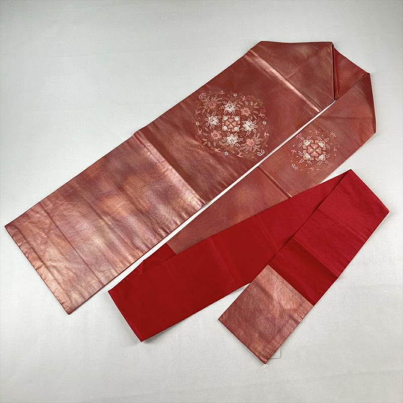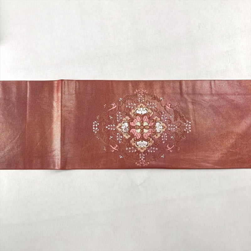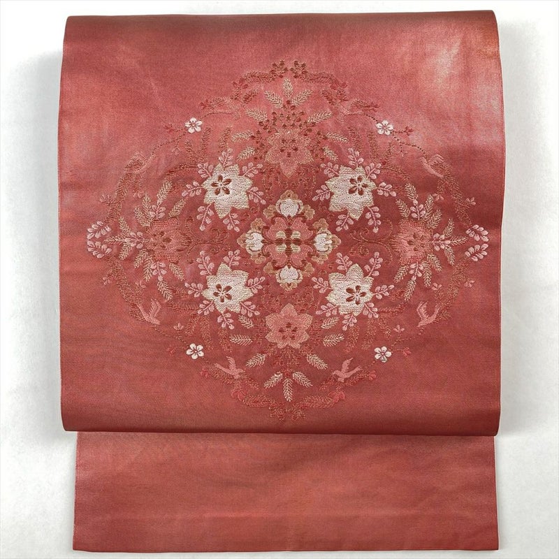 優しい赤色の地に、オリエンタルな花鳥柄が織り出された、正絹の名古屋帯です。