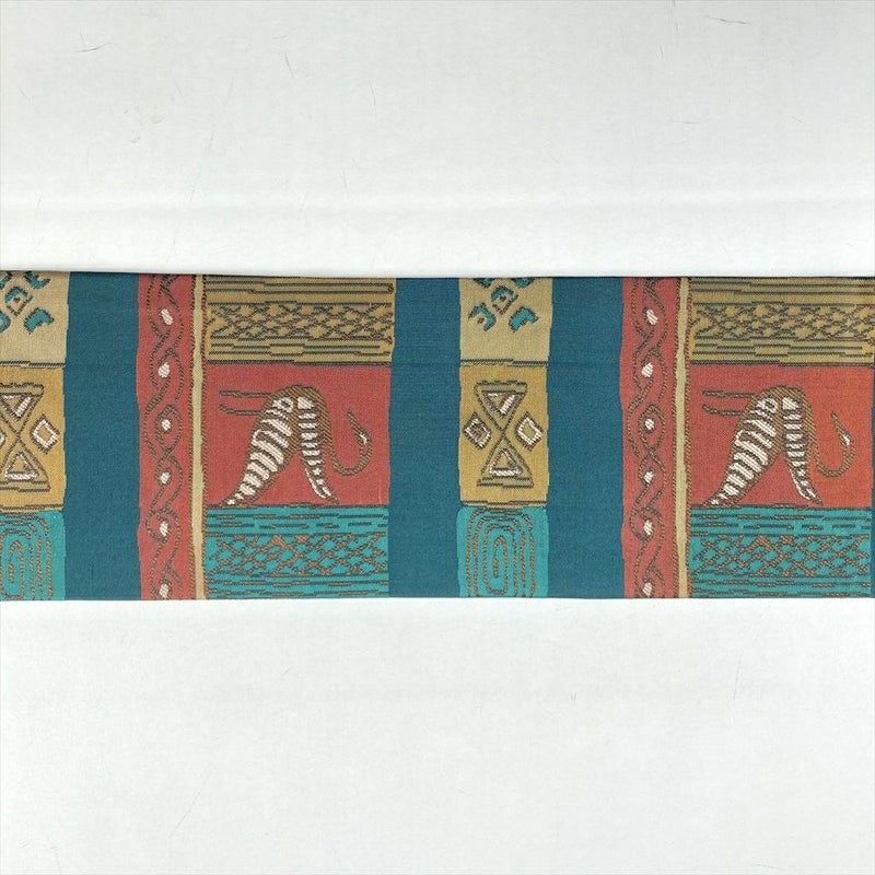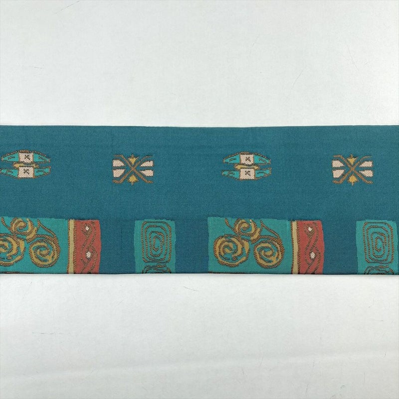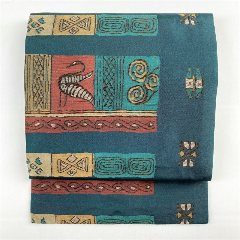 (中古)名古屋帯 濃青緑 カジュアル 名古屋仕立て 織り 鳥 幾何学柄