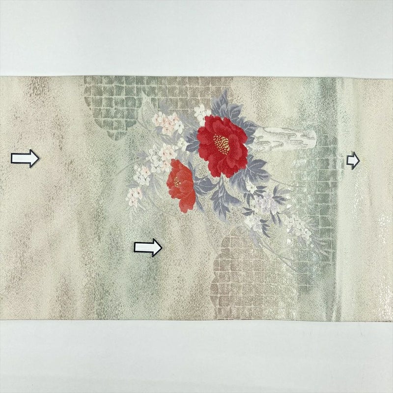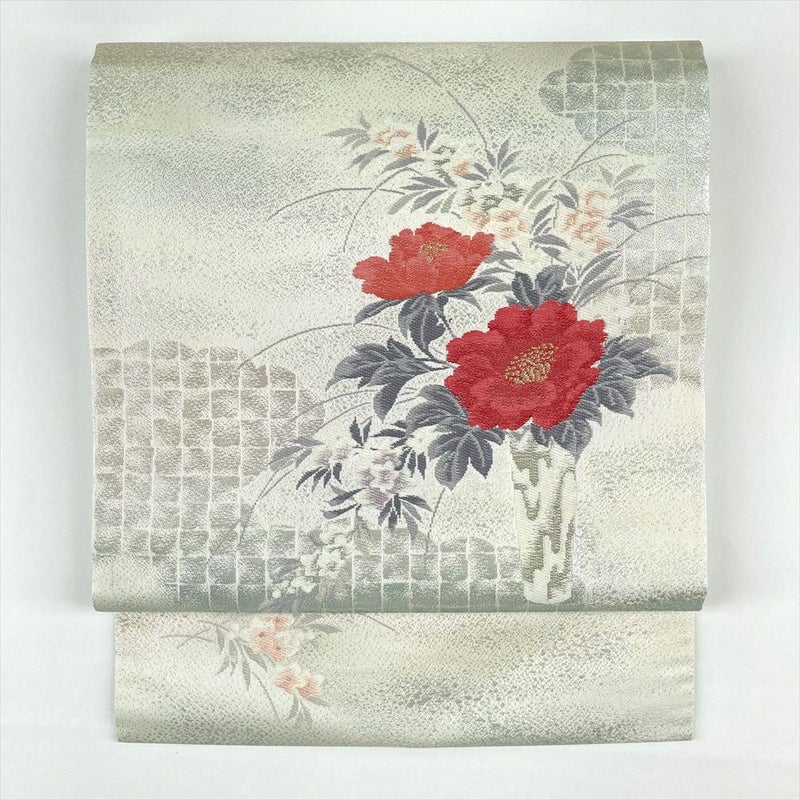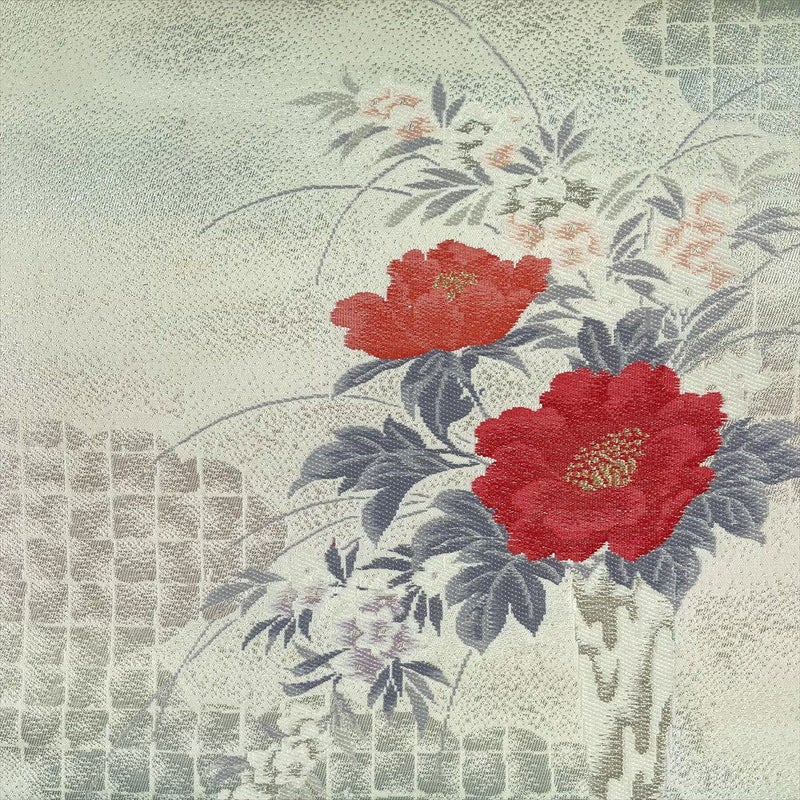 【色柄】銀色 生成り色 カジュアル 雲 生け花 牡丹 竜胆 切箔 金糸 銀糸