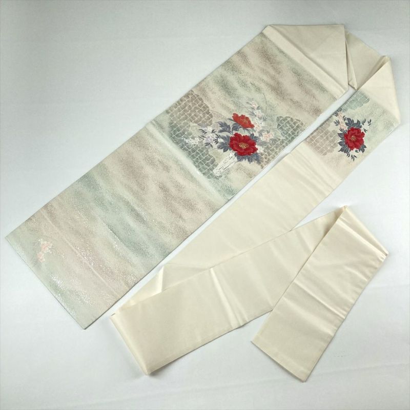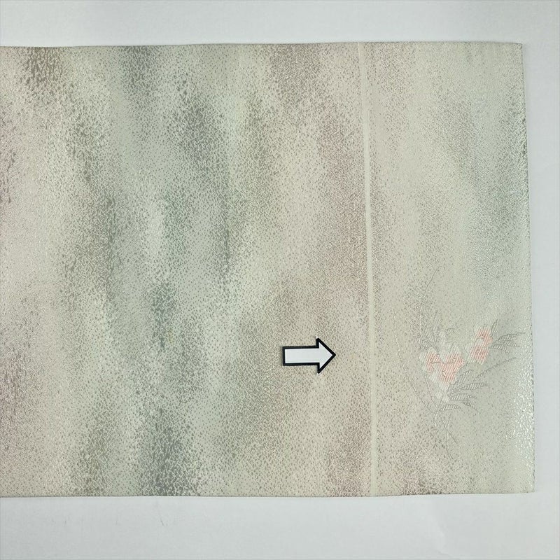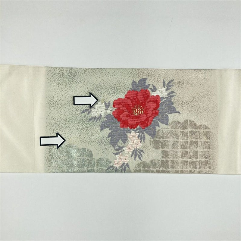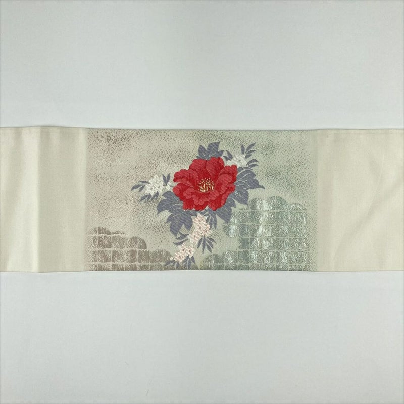 (中古)名古屋帯 銀色 生成り色 カジュアル 名古屋仕立て 切箔 金糸 銀糸 雲 生け花 牡丹 竜胆